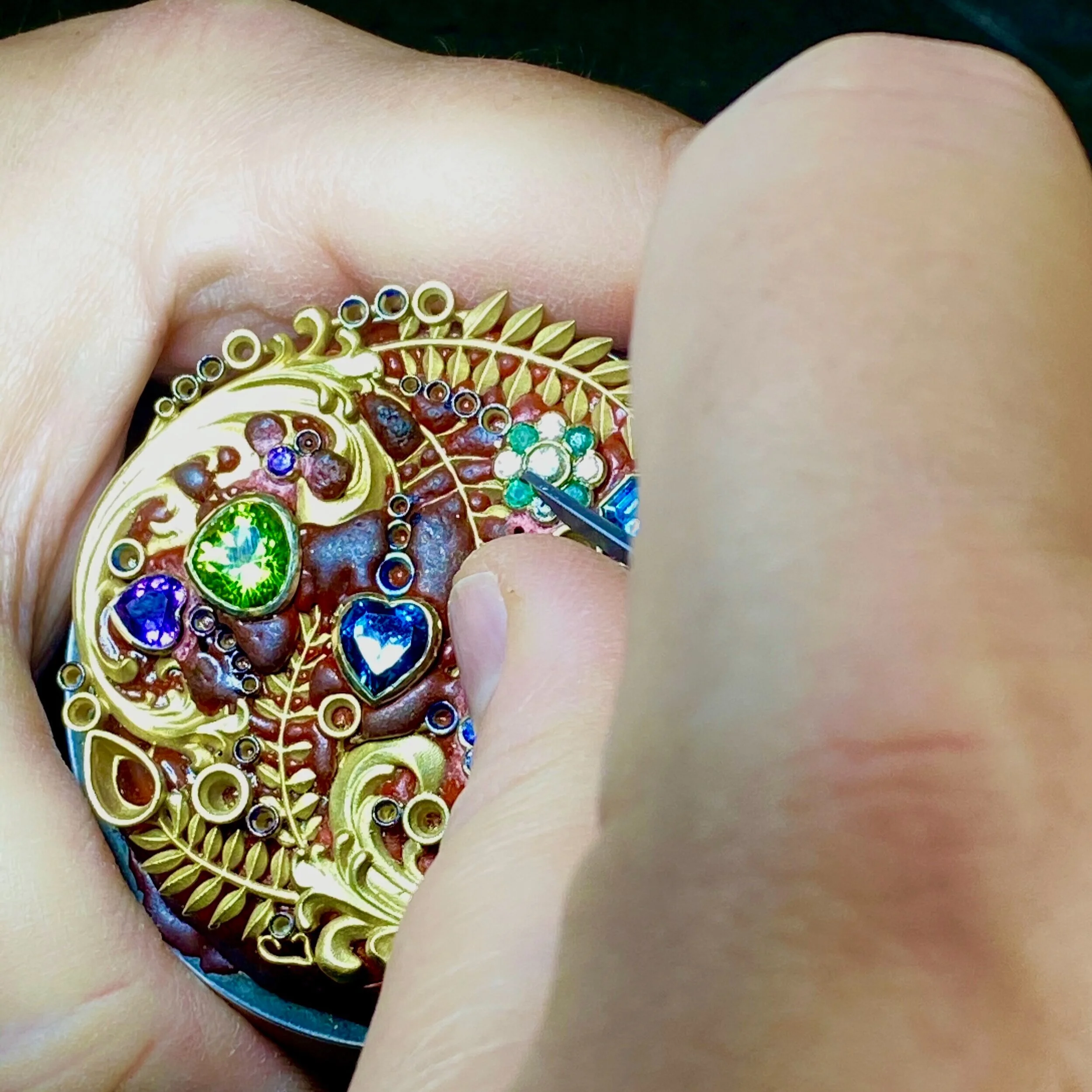 Stone setting takes place under a microscope, where diamonds and gemstones are meticulously set into the piece of jewellery. This exact work requires the utmost care and attention to detail. Our in-house setting team is respected throughout the industry for their work. Once the stone setting is complete a final polish is applied and then we move on to quality control for the final checks.