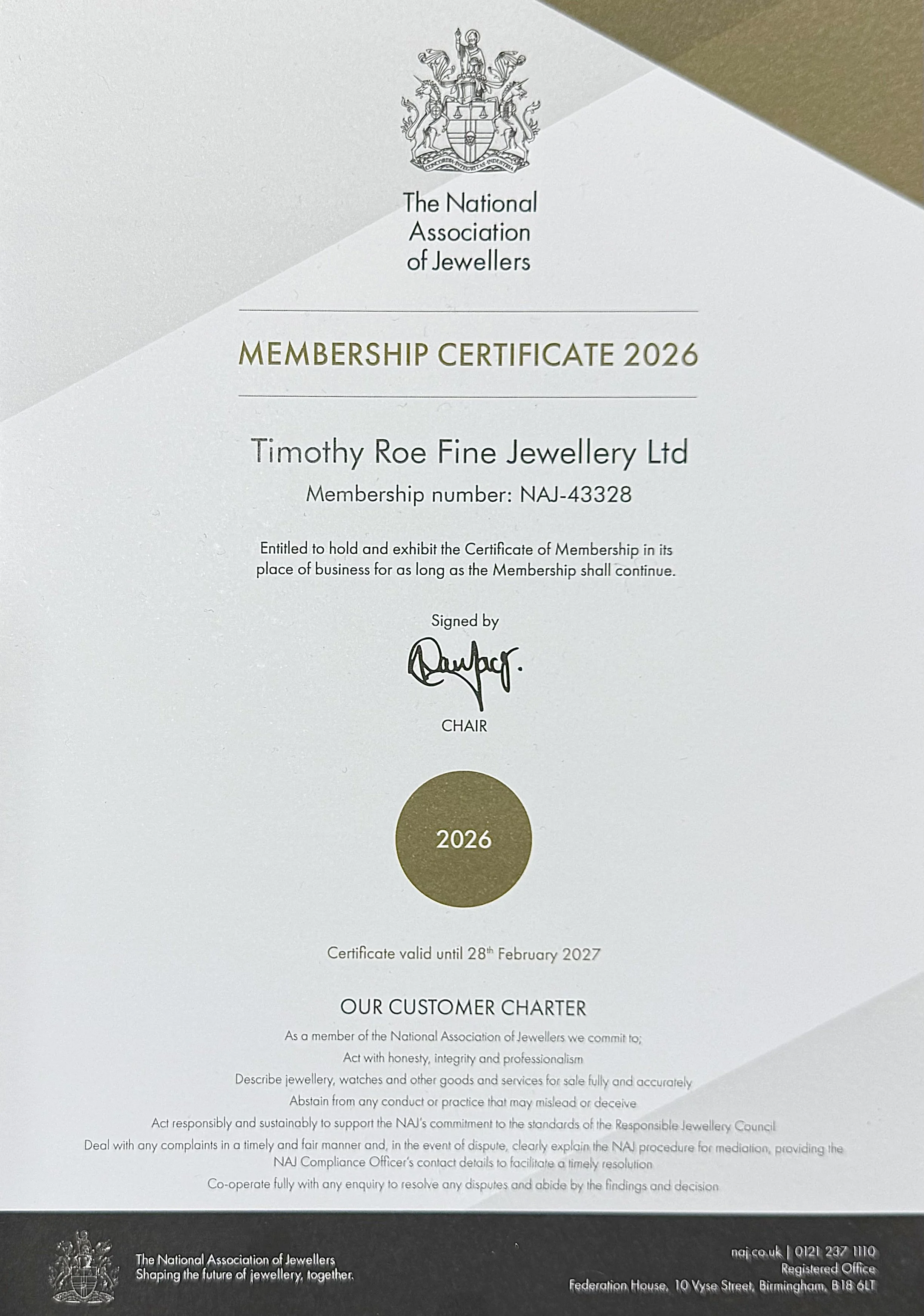 Timothy Roe Fine Jewellery Ltd. has been a long-time NAJ member (membership number 43328) since opening in 1996. This long-standing affiliation reflects a sustained commitment to the principles and standards upheld by the association. For customers, such continuity of membership demonstrates not only compliance with industry expectations but also a dedication to maintaining excellence, ethical conduct, and professional development over decades of trading.