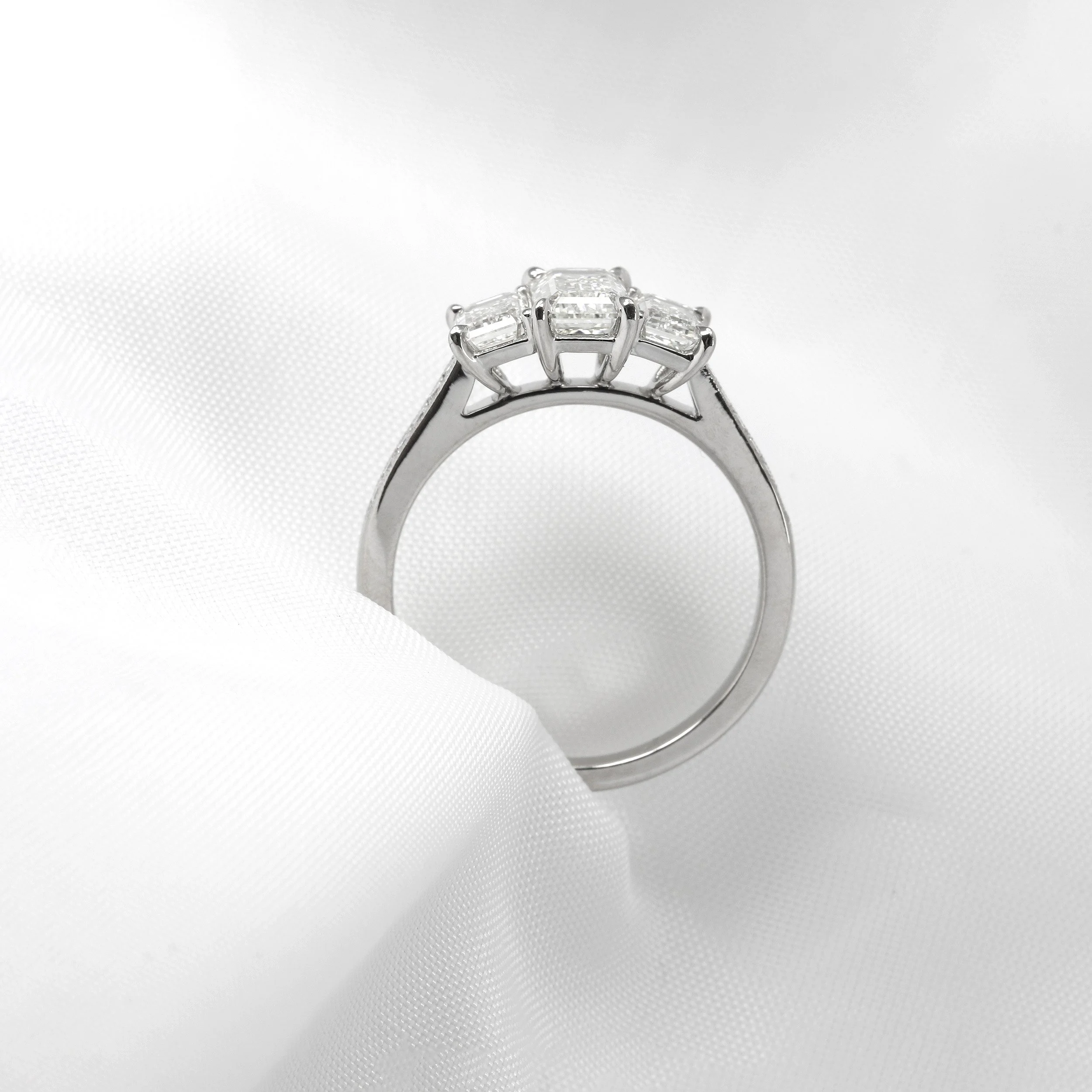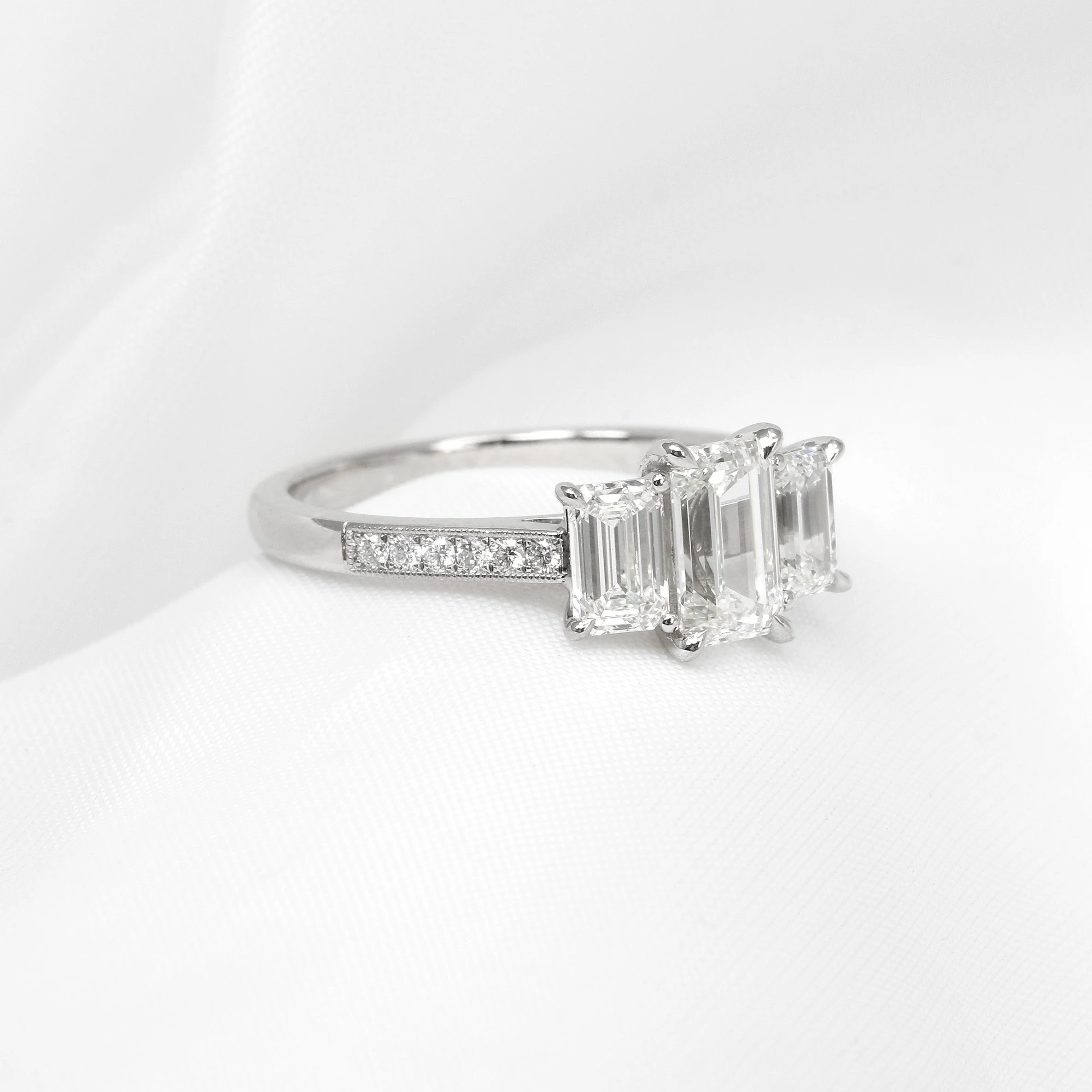 Three elegant cut emerald diamonds, beautifully set on a solid platinum band with brilliant cut diamonds down the shoulders in our signature millegrain finish. Handcrafted in-house by our experts.