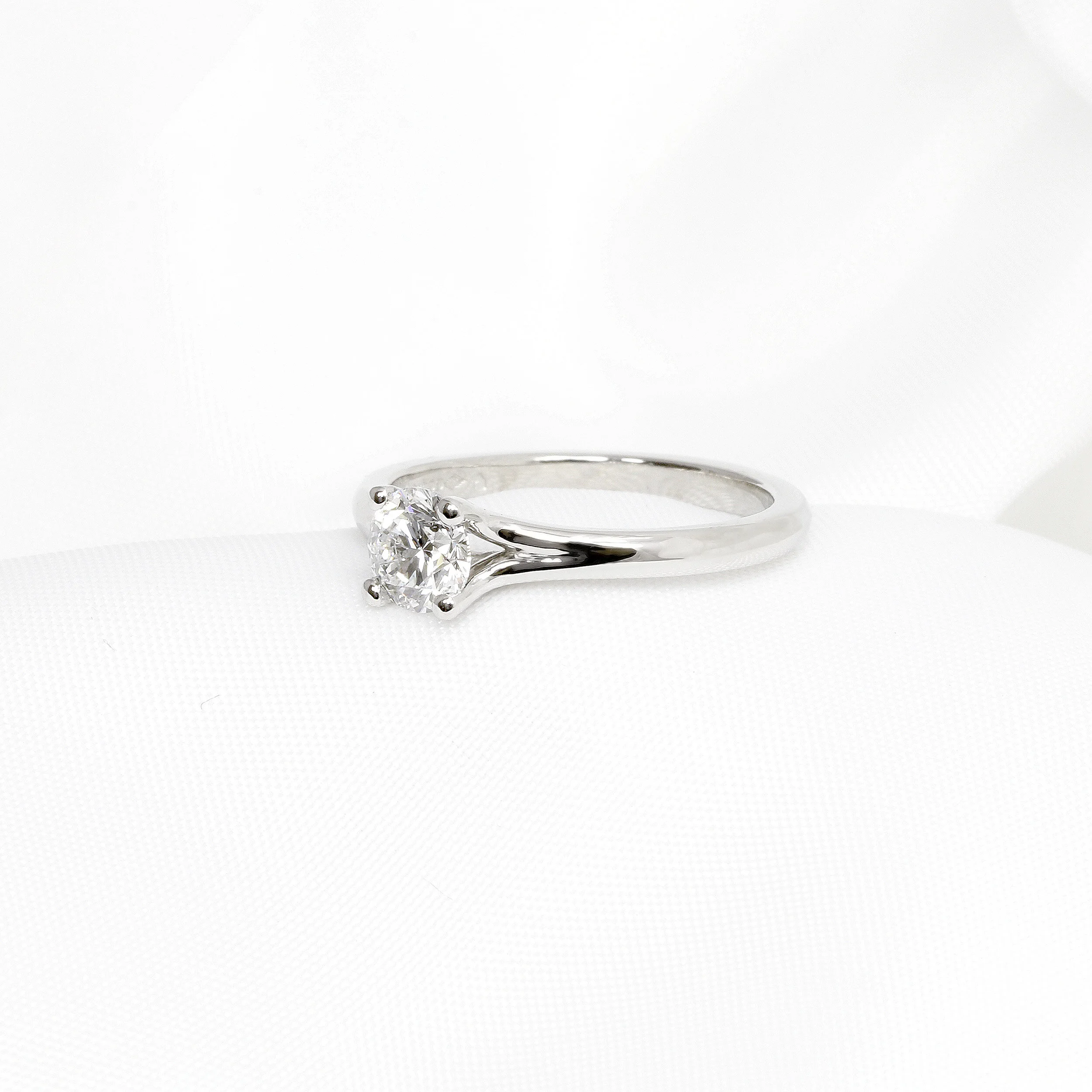A stunning 0.50ct round brilliant certificated diamond in a claw style solitaire setting. This ring has been handcrafted in platinum with split shoulder detail on the band.