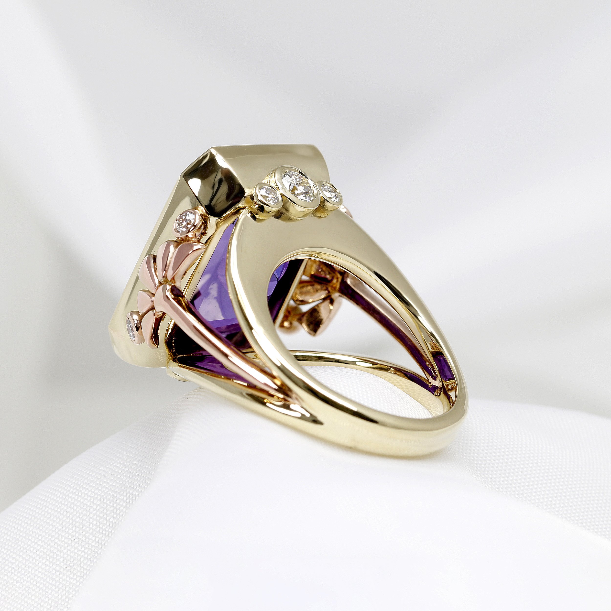 A striking octagonal 15.45ct step cut amethyst, set in a rub-over setting, with the Timothy Roe signature setting, adorned with diamonds. This ring has been handcrafted in 18ct yellow gold, with 18ct rose gold accents.