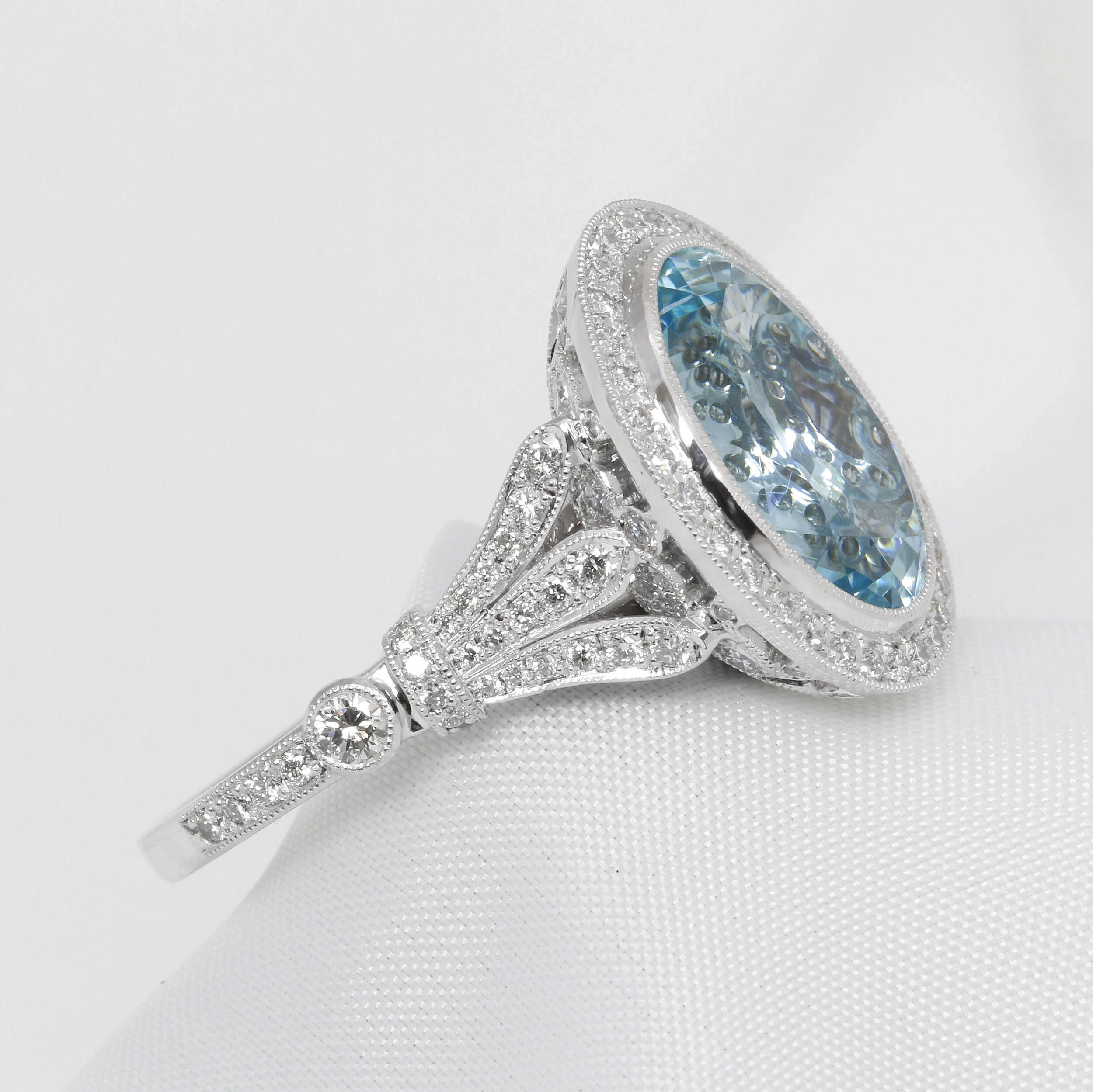 A magnificent 5.50ct oval aquamarine, set in an intricate diamond filigree setting, including a diamond halo. This ring is handcrafted in 18ct white gold,