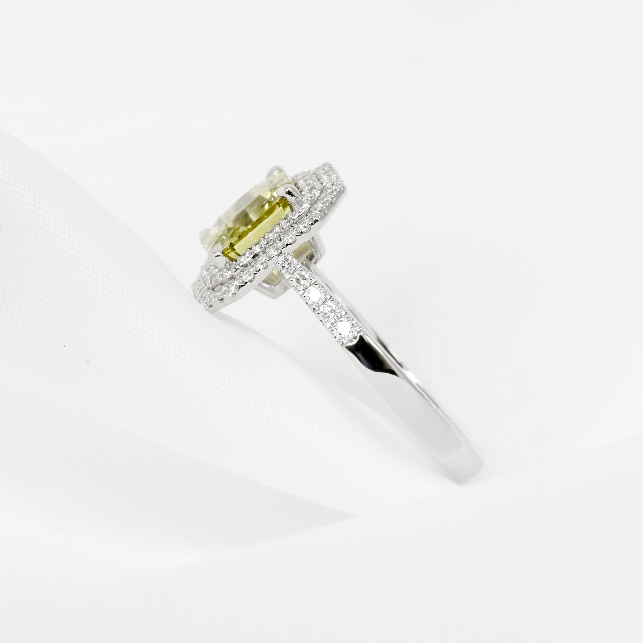 A central cushion cut 1.93ct chrysoberyl, with a double halo of round brilliant diamonds. This ring has been handcrafted in platinum with a diamond set band.