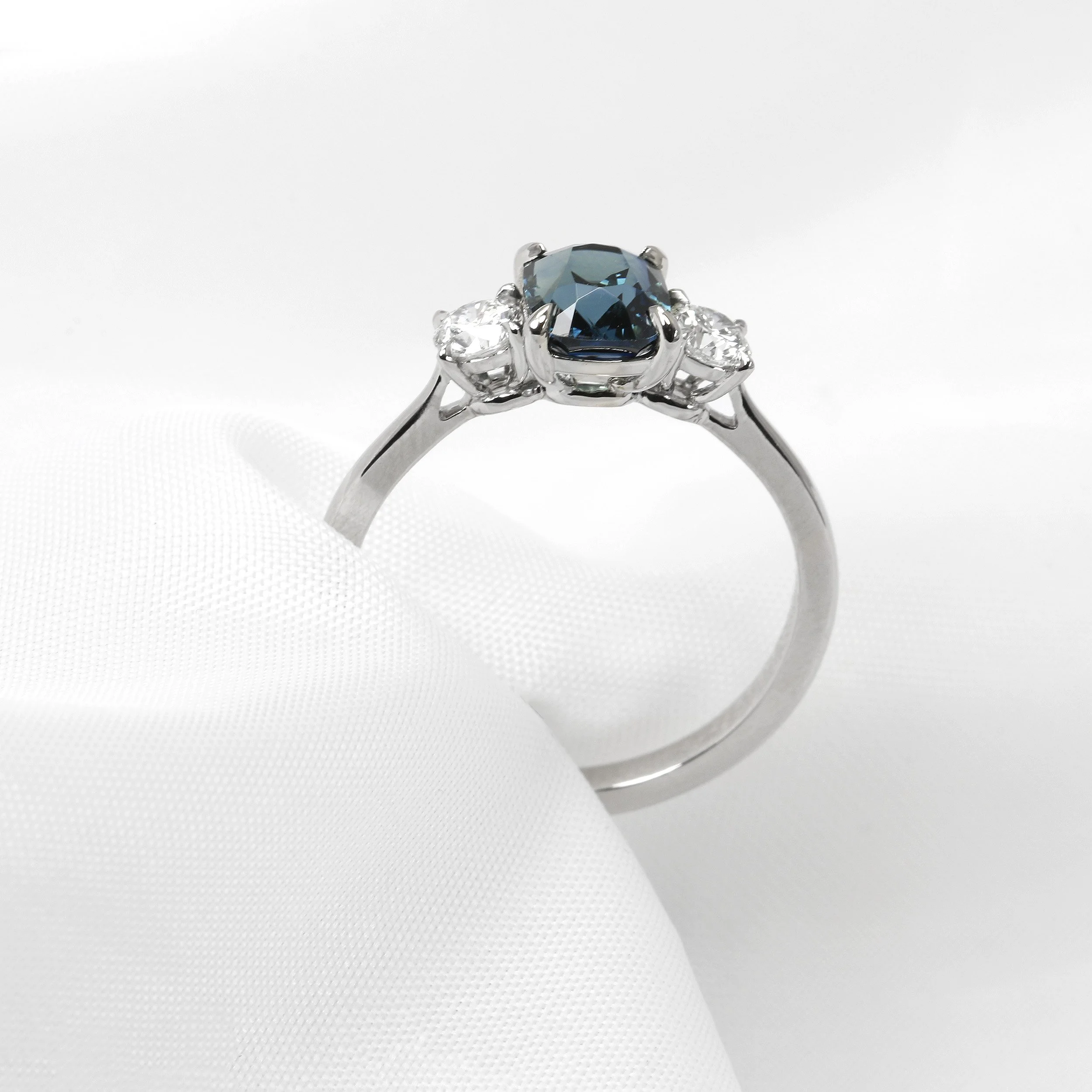 A striking cushion cut teal sapphire, elegantly paired with two modern round brilliant diamonds for additional sparkle. Each stone is secured in refined talon-claw settings, enhancing brilliance and adding a contemporary finish. Hand crafted in platinum and hallmarked with the Chichester Cross mark.