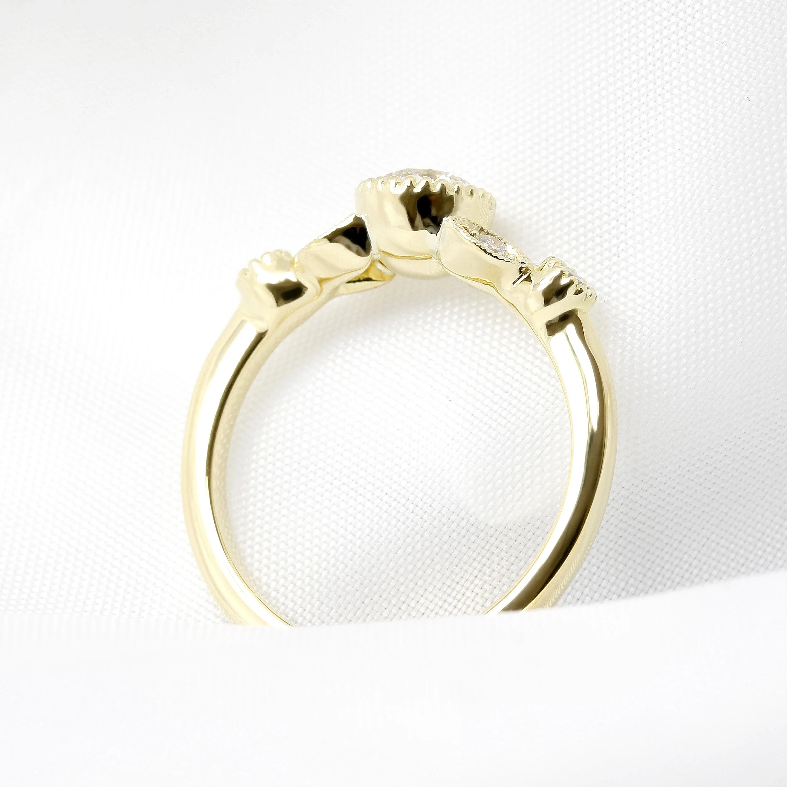 An enticing central 0.50ct round brilliant diamond, set with six round brilliant diamonds in a foliate pattern, all rub-over set with millegrain edges. This ring has been handcrafted in 18ct yellow gold and forms part of our Jardin Des Délices Collection.