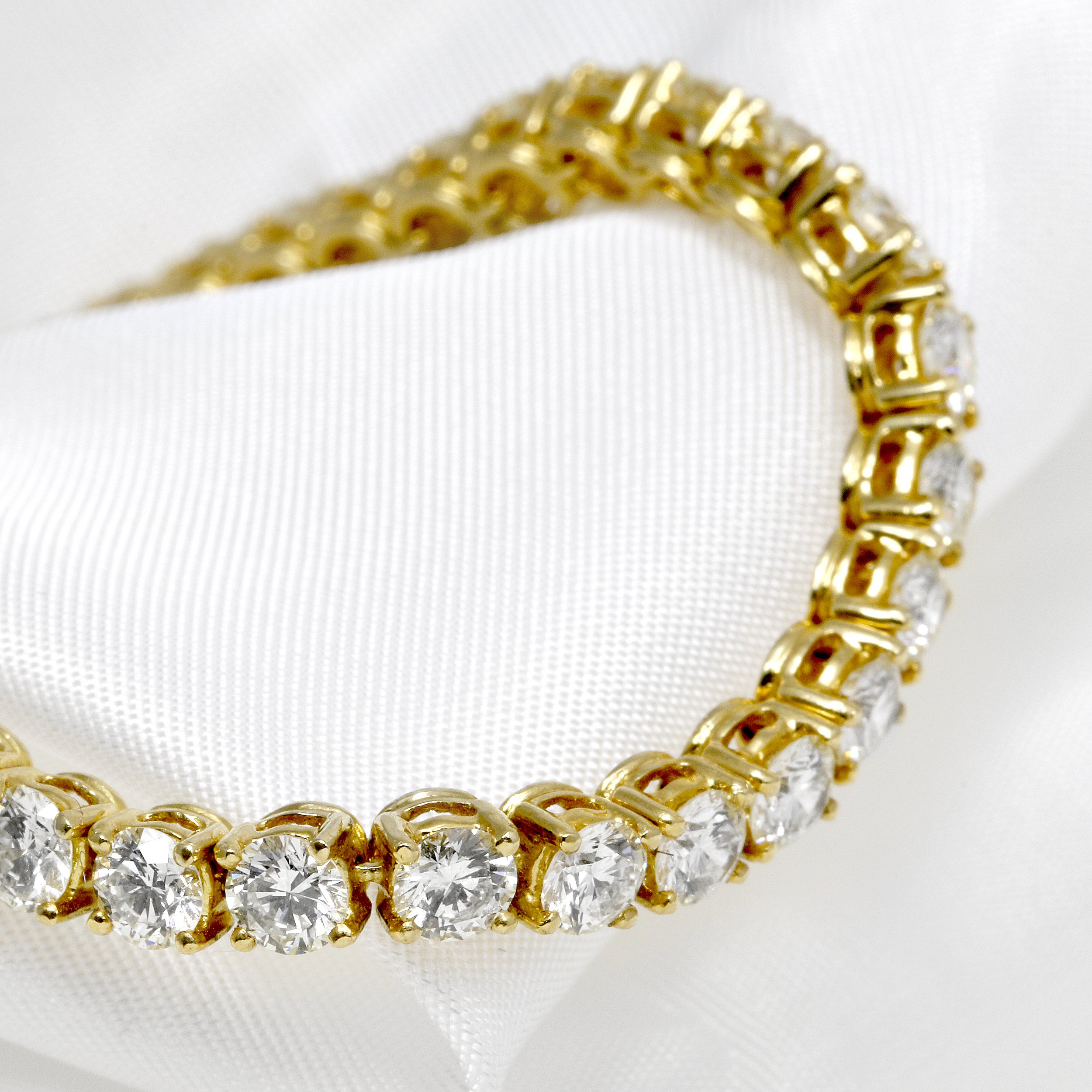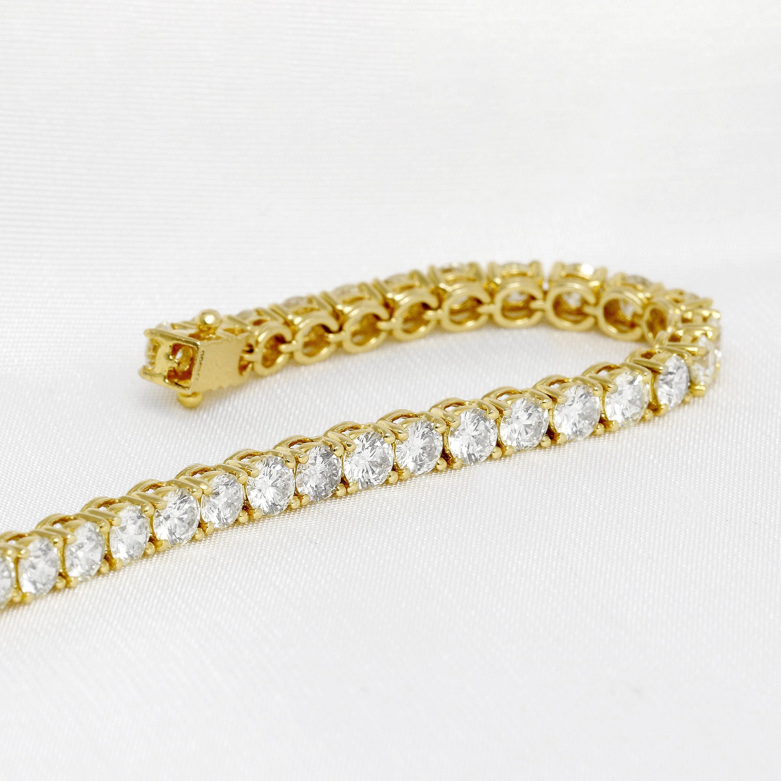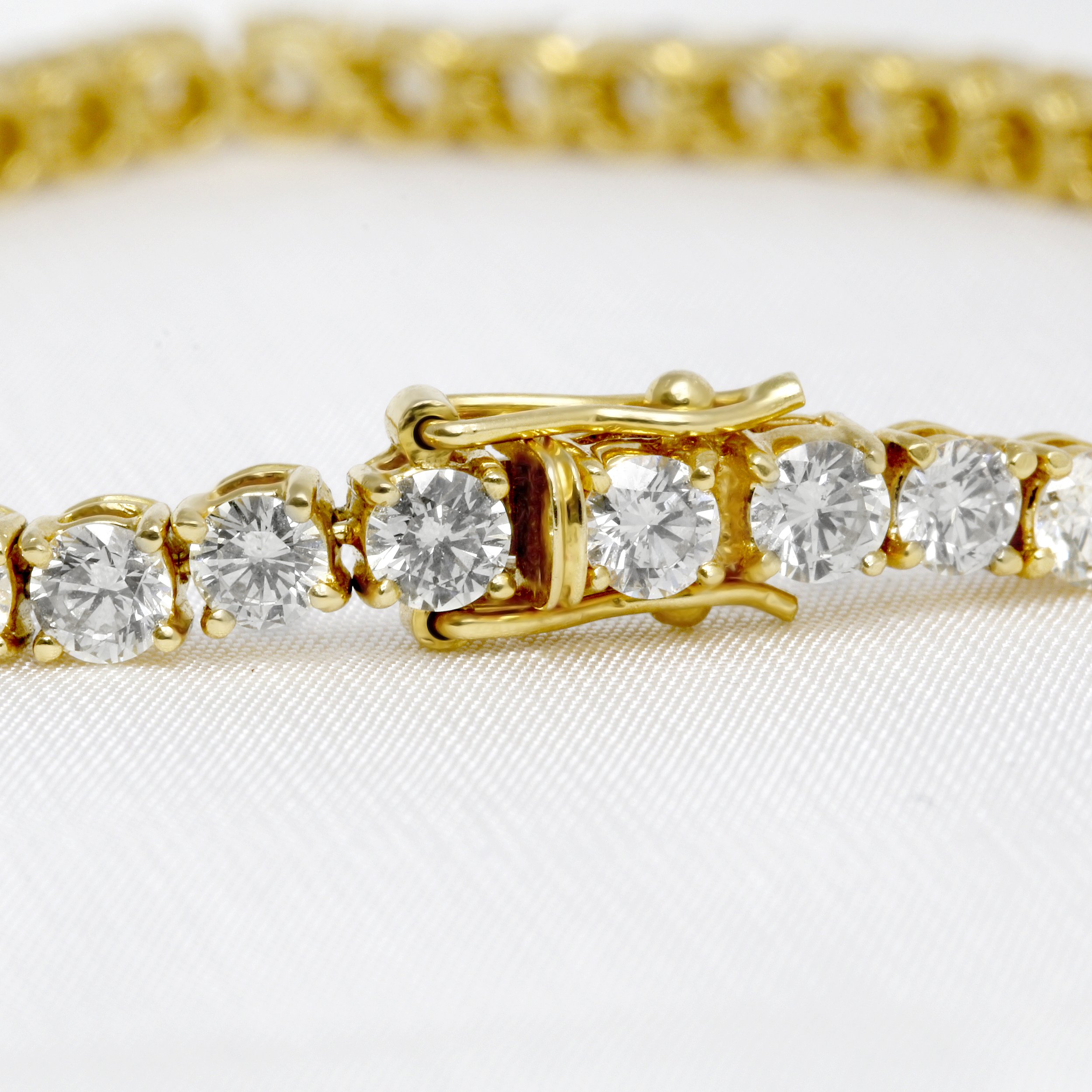 A stunning diamond line bracelet, featuring 48 round brilliant diamonds with a total weight of 8.15cts, set in luxurious 18ct yellow gold.