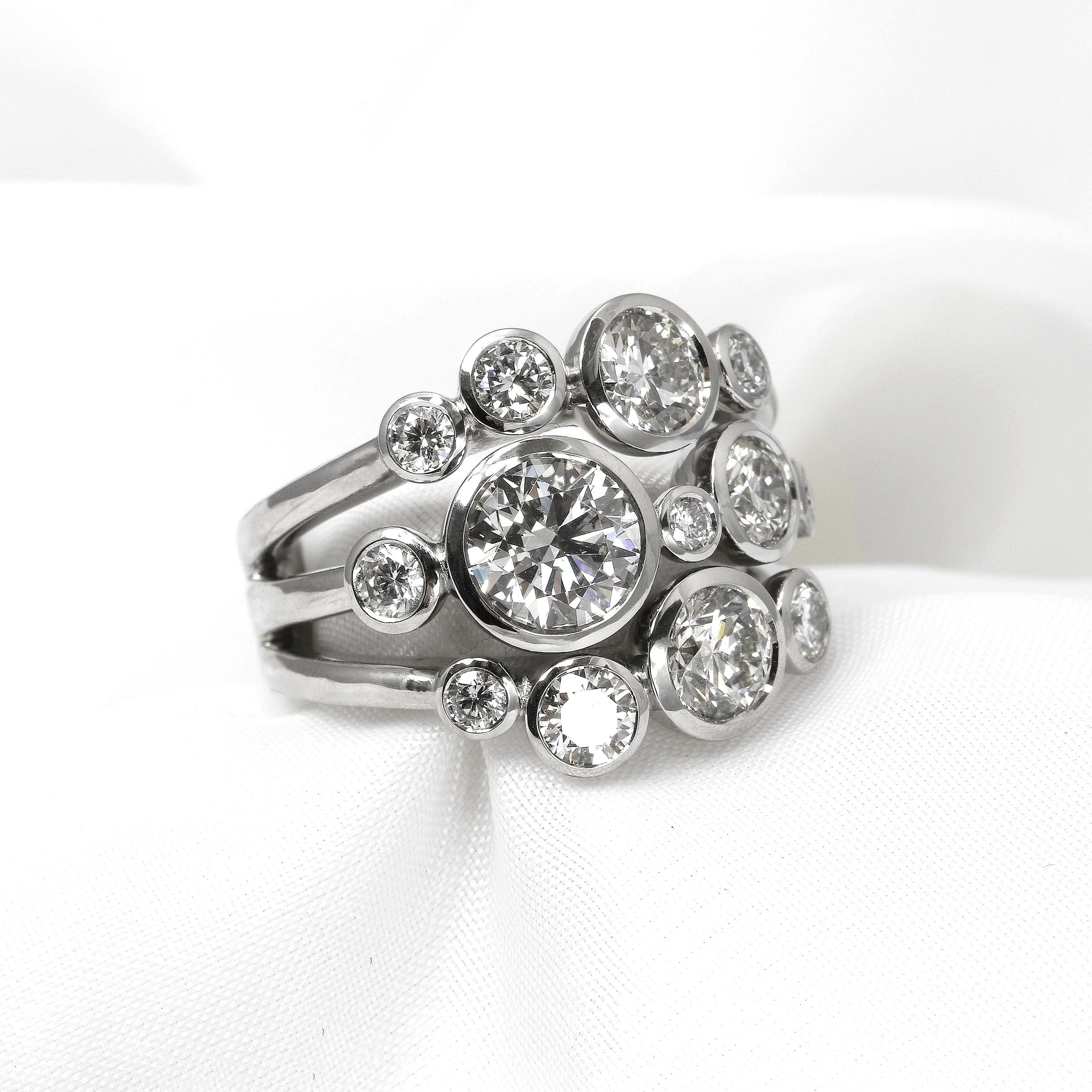 A magnificent multi band ring set with thirteen round diamonds, totalling 3.37cts. The five largest stones are GIA certificated. Each stone has been individually rub-over set and scattered along three bands. This ring has been handcrafted in platinum.
