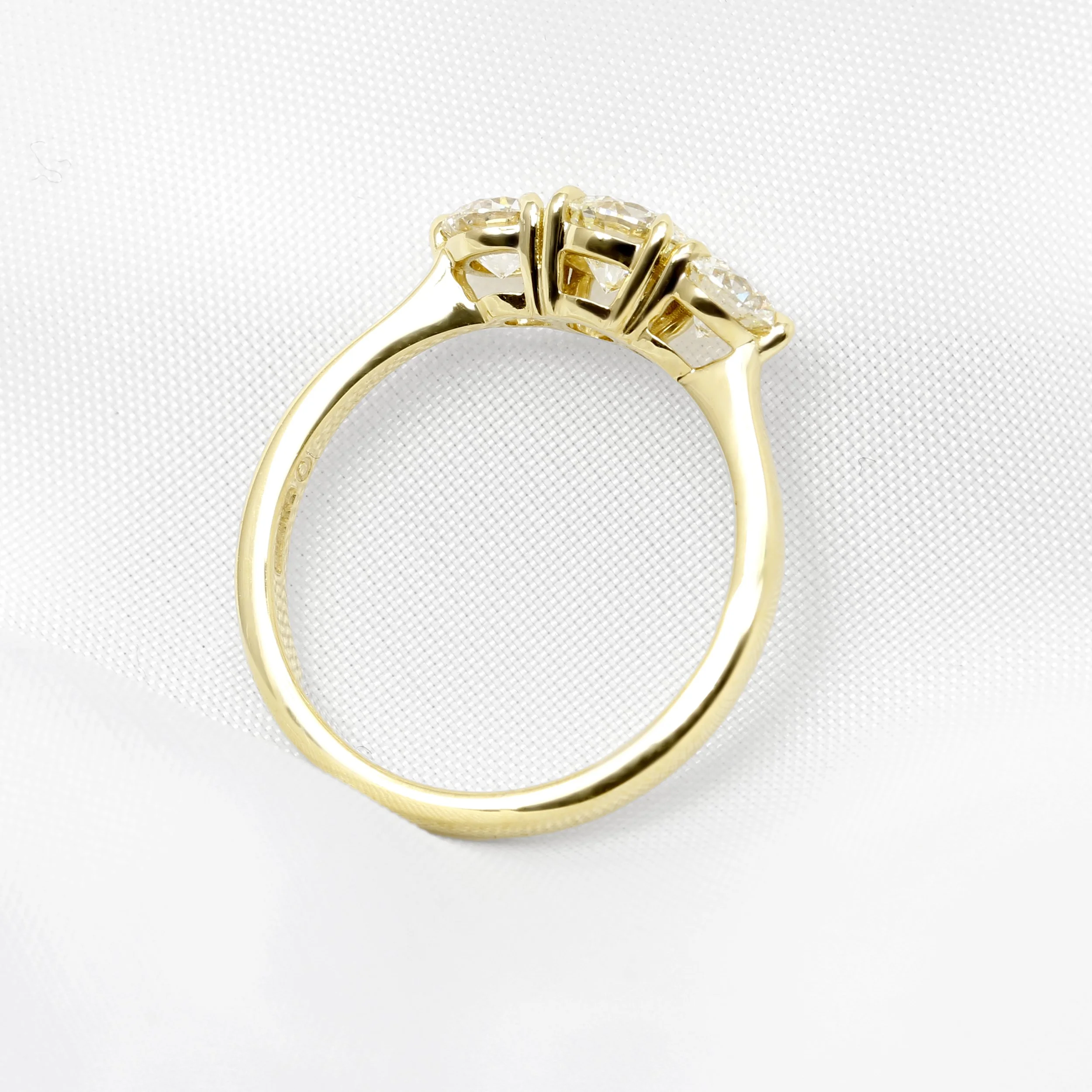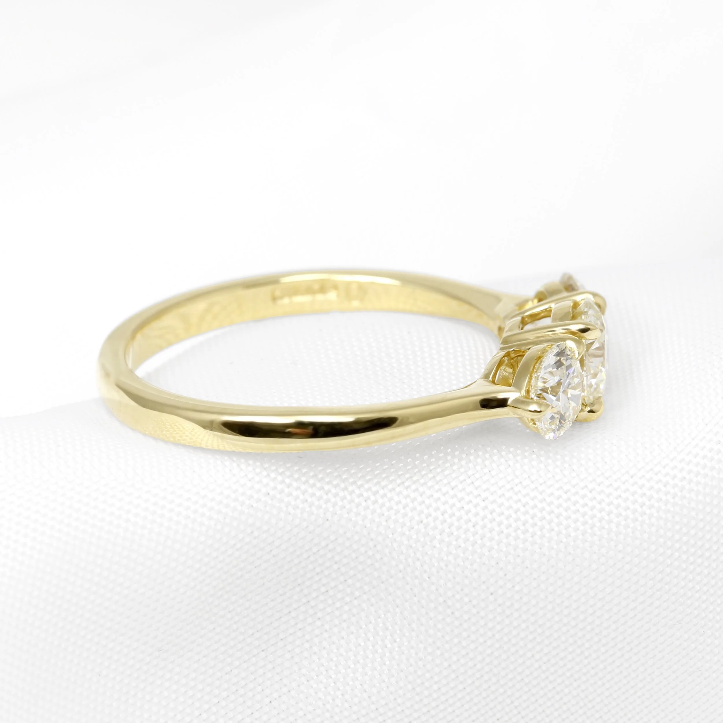 A captivating three stone ring, with a central 0.50ct certified modern round brilliant diamond, accompanied by two 0.30ct certified modern round brilliant side diamonds. This ring has been handcrafted in 18ct yellow gold and has claw settings with talon claws.
