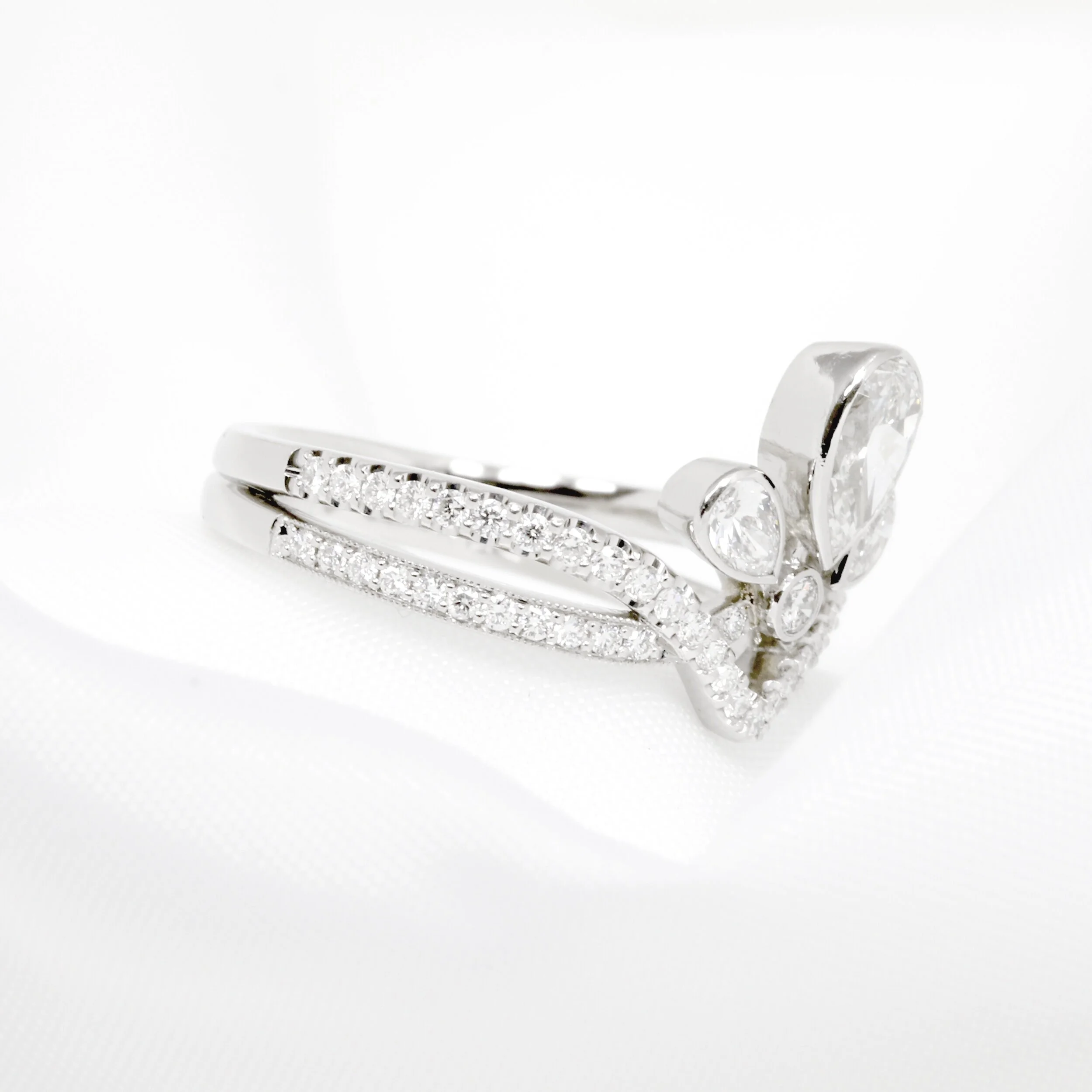 An exquisite pear shaped diamond tiara ring. Featuring a principle 0.52ct pear shaped diamond, accompanied by two accent pear shaped diamonds totalling 0.35ct. Set in a tiara style setting with two rows of grain set round brilliant diamonds, and all handcrafted in platinum.