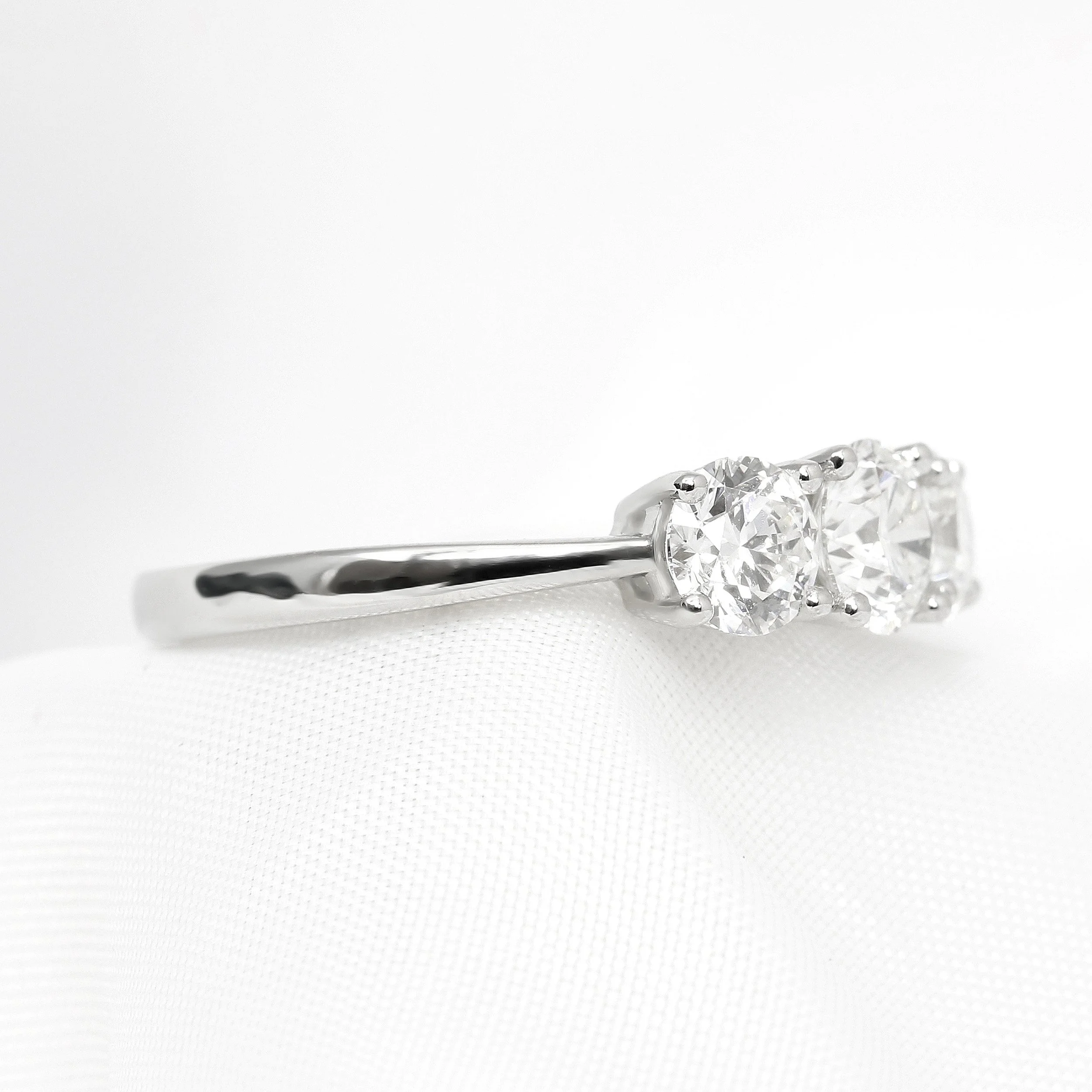 A magnificent three stone diamond ring, featuring a central 0.60ct diamond championed by two 0.45ct side stones, all certified round brilliant cut diamonds. Set into handcrafted platinum with classic claw settings.