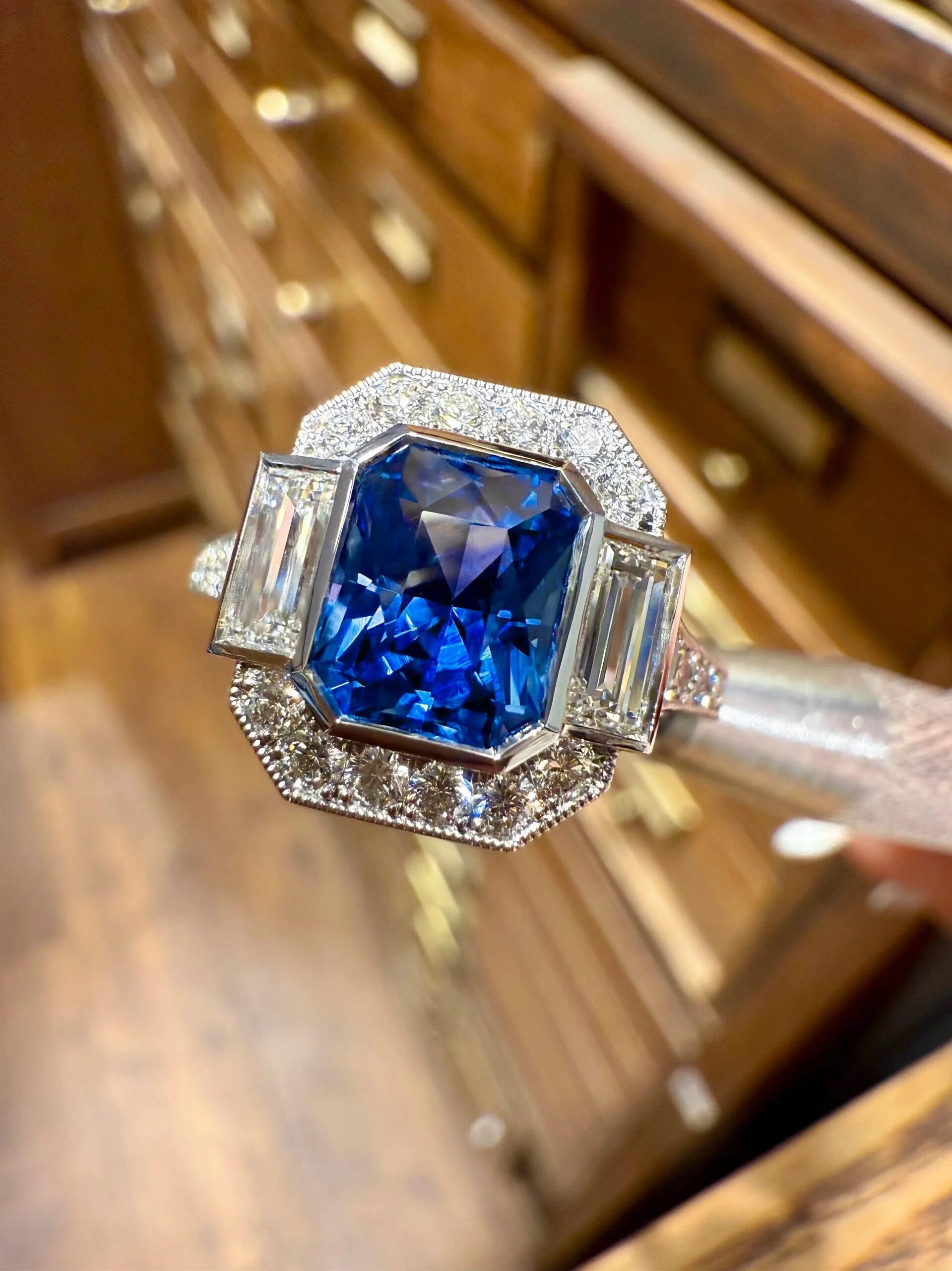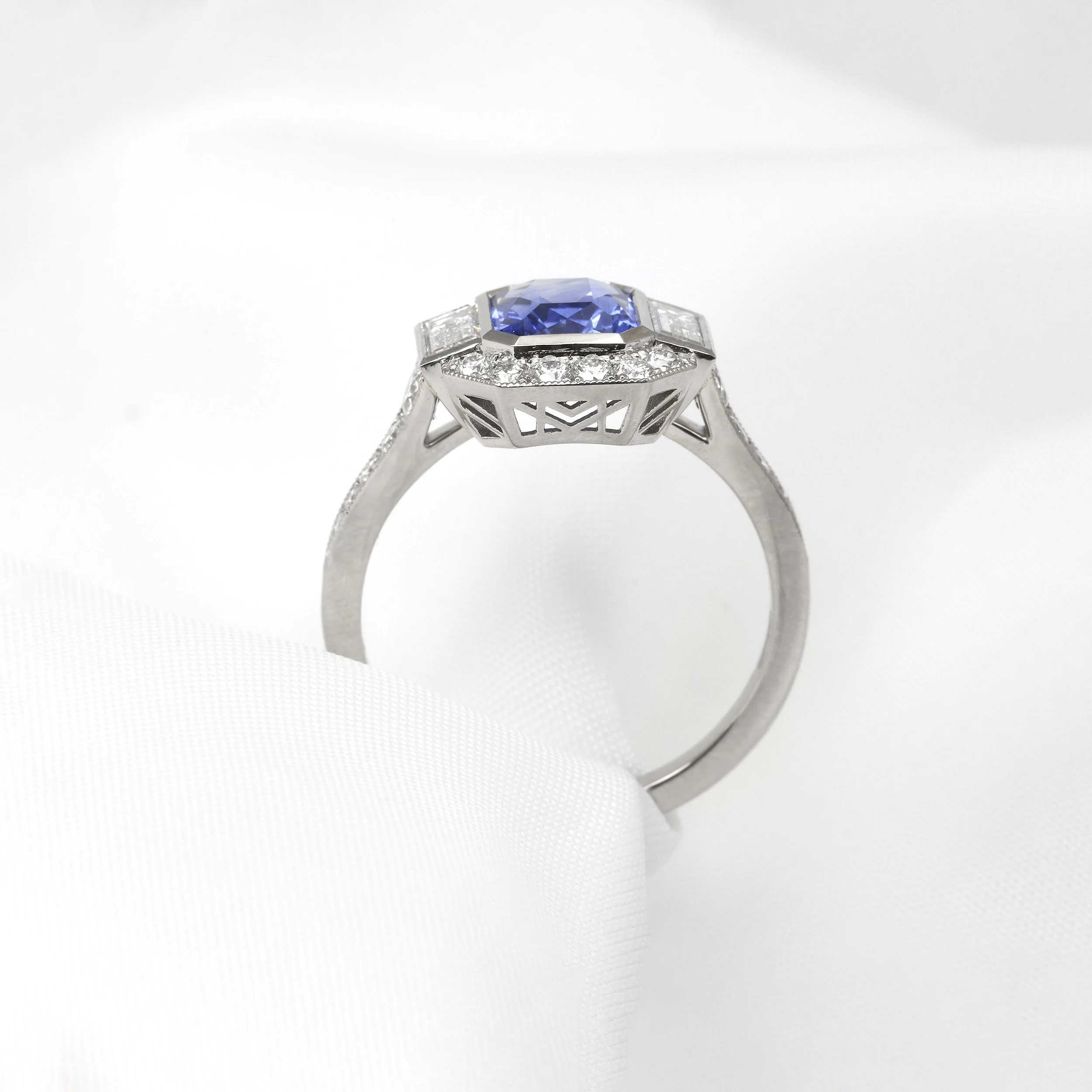 A stunning sapphire and diamond Edwardian style cluster ring. A central radiant cut 1.90ct blue sapphire set with two side rub-over set baguette diamonds, both GIA certified, with a halo of grain set modern round brilliant diamonds. This ring has been handcrafted in platinum with a tapered diamond grain set shoulders.