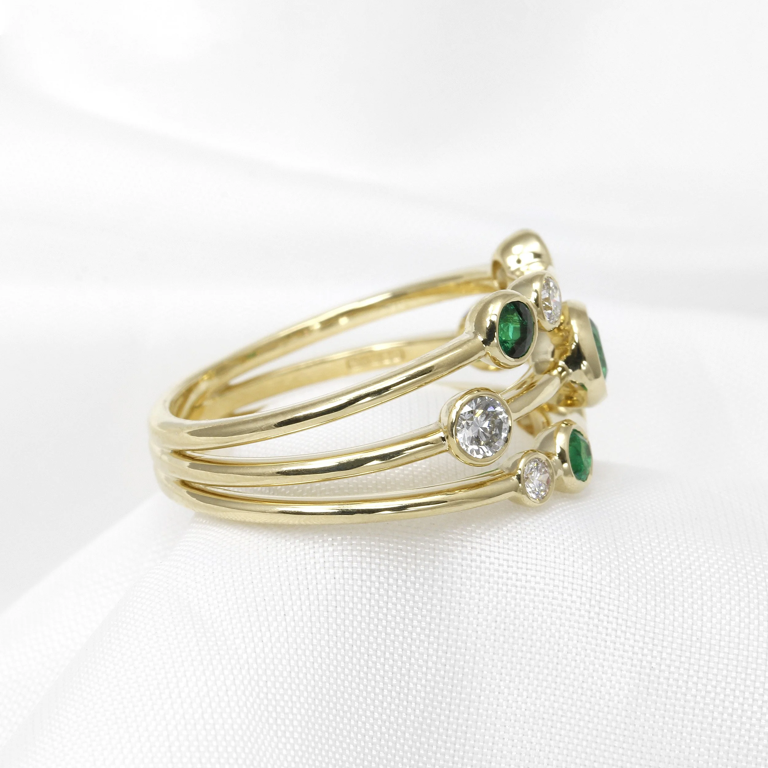 A stunning multi-band ring set with 4 round emeralds totalling 0.63cts and 4 round brilliant diamonds totalling 0.52cts. Each stone has been individually rub-over set and scattered along three bands. This ring has been handcrafted 9ct yellow gold