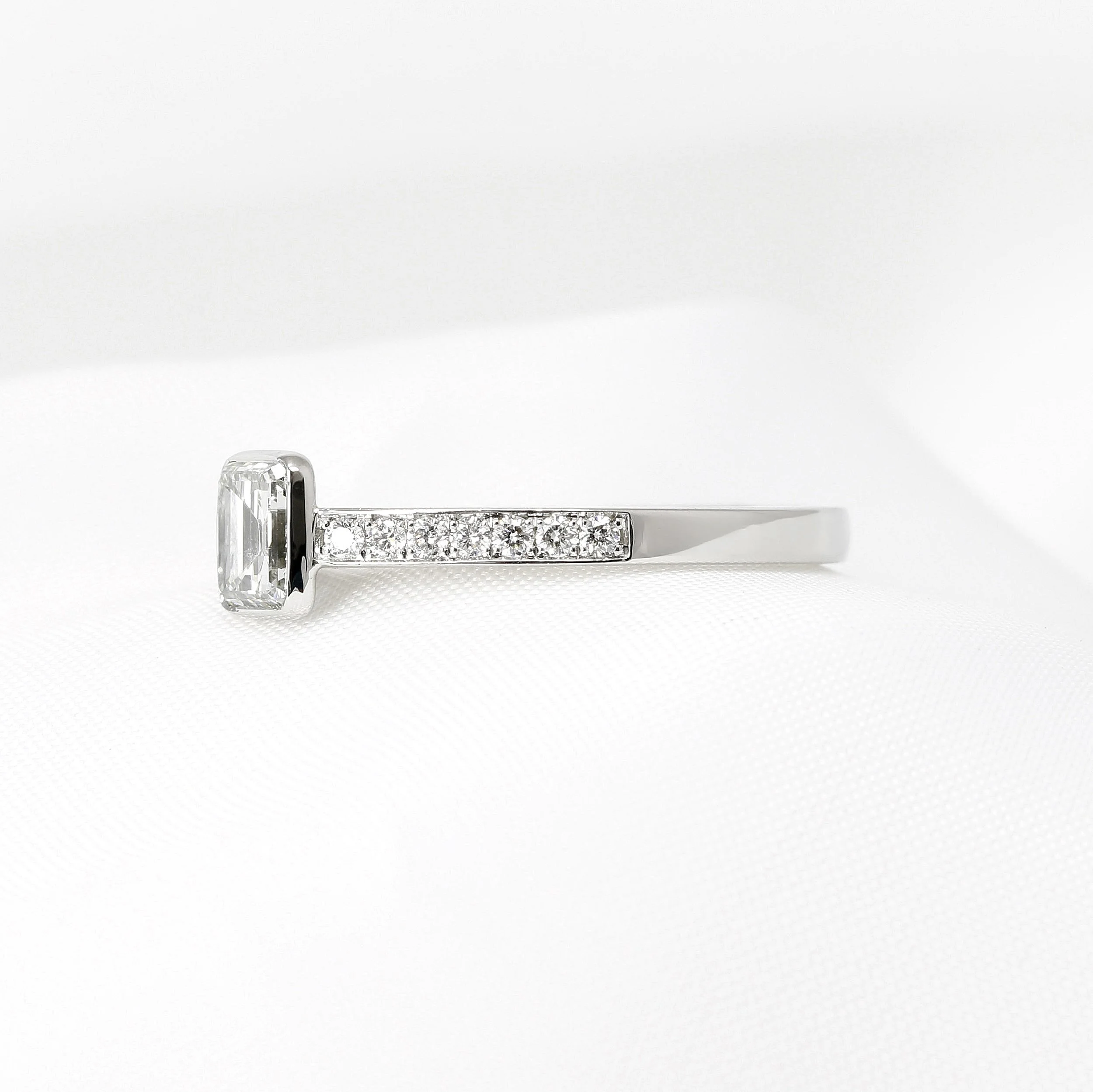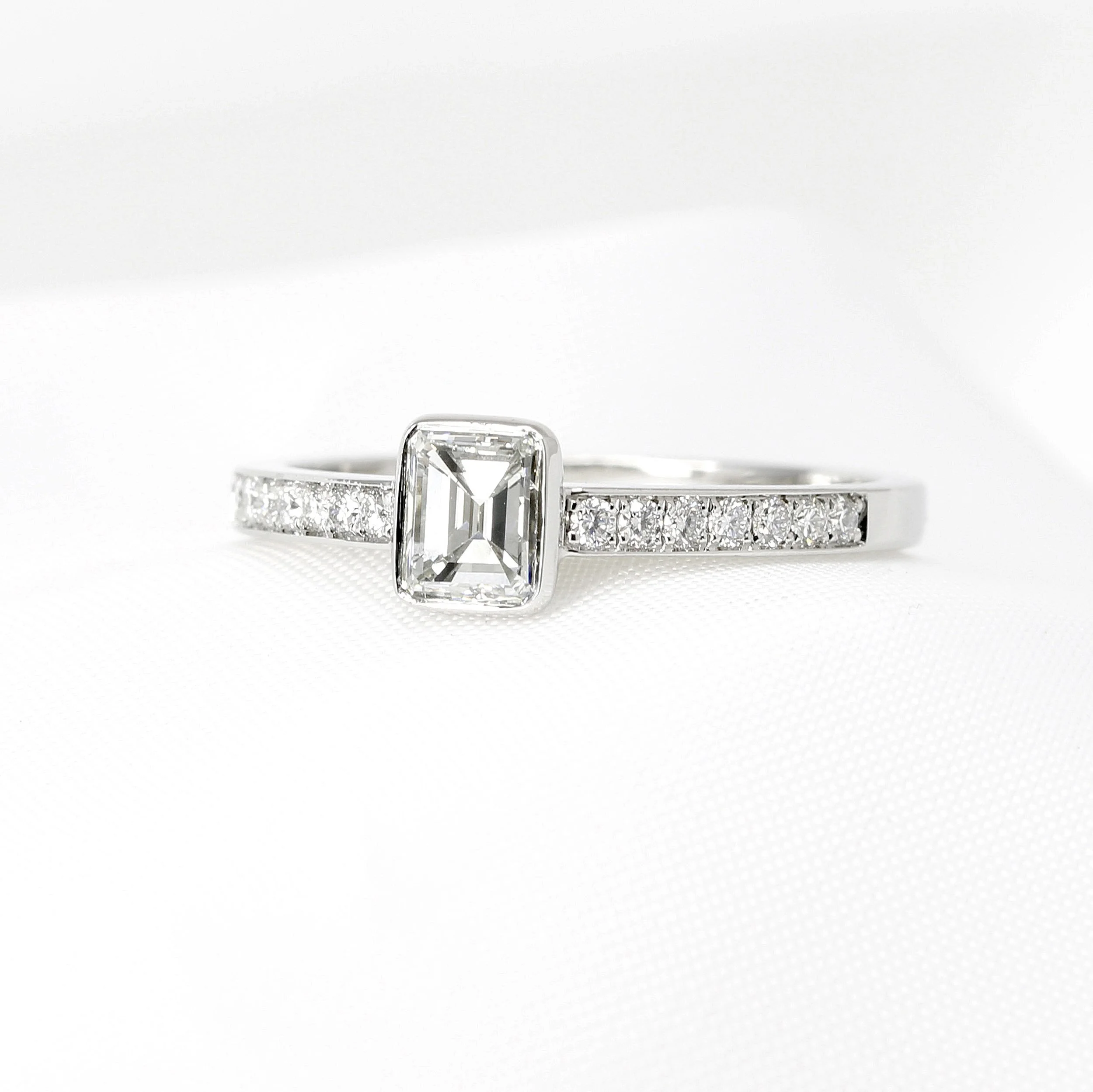 A stunning 0.50ct emerald cut diamond, set in a rub-over style setting, in this lovely solitaire ring. This ring has been handcrafted in platinum, and features a diamond set band, set with modern round brilliant diamonds.