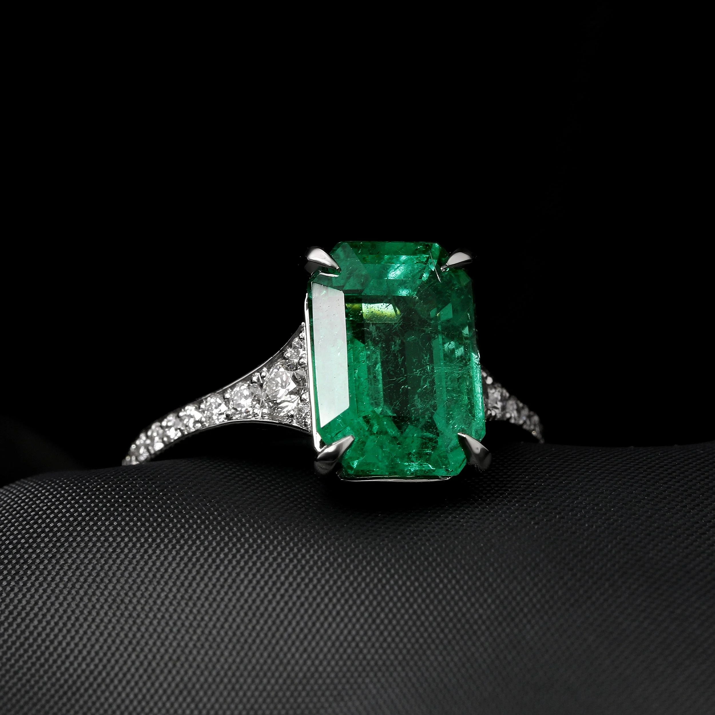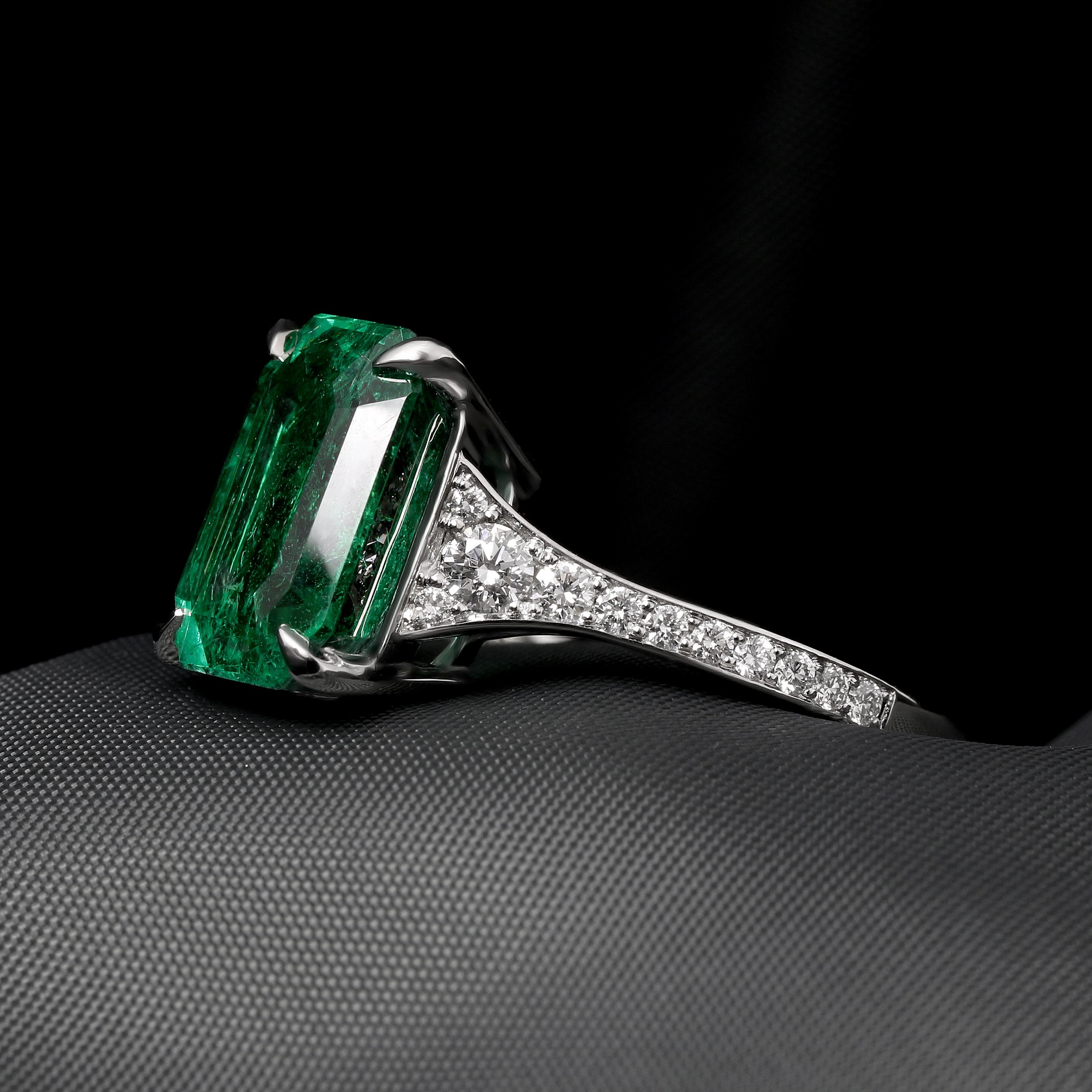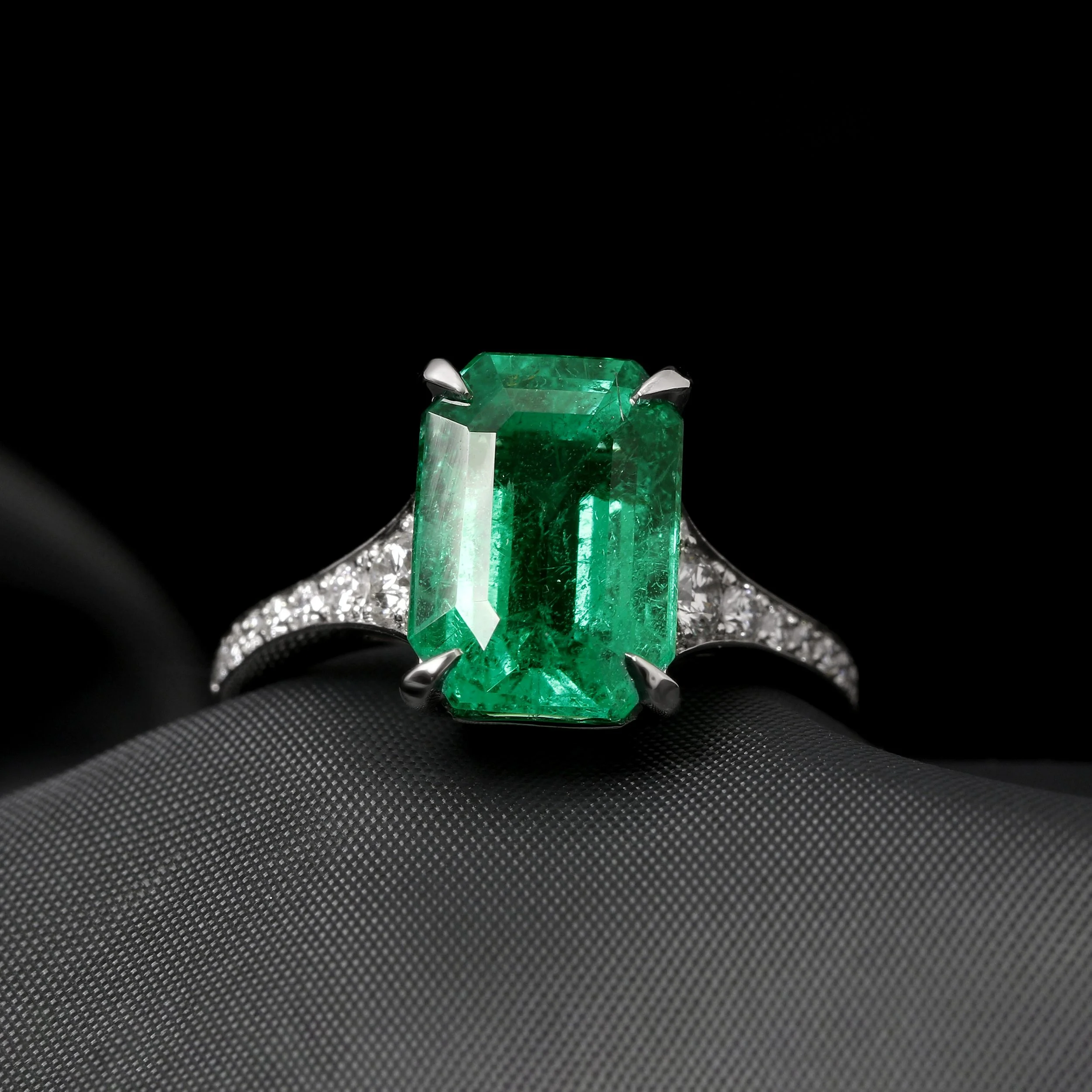 A breathtaking rich green certificated 4.30ct octagonal cut emerald, set in modern talon style claws. This ring has been handcrafted in platinum, featuring a tapered grain set diamond band.