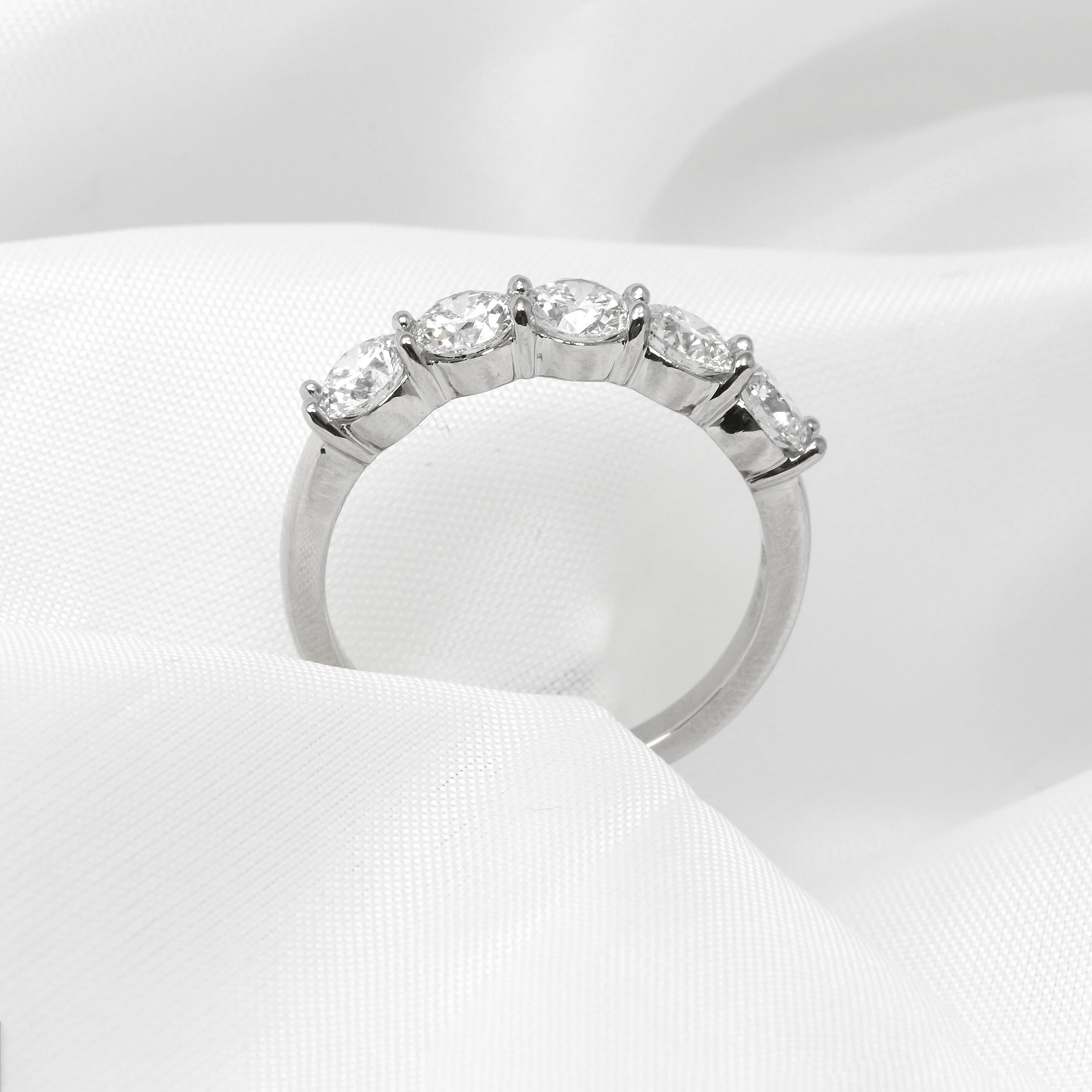 A radiant diamond five stone ring. Set with five matching 0.30ct GIA certificated modern round brilliant diamonds, totalling 1.50cts. This ring has been handcrafted in platinum and features claw style setting.