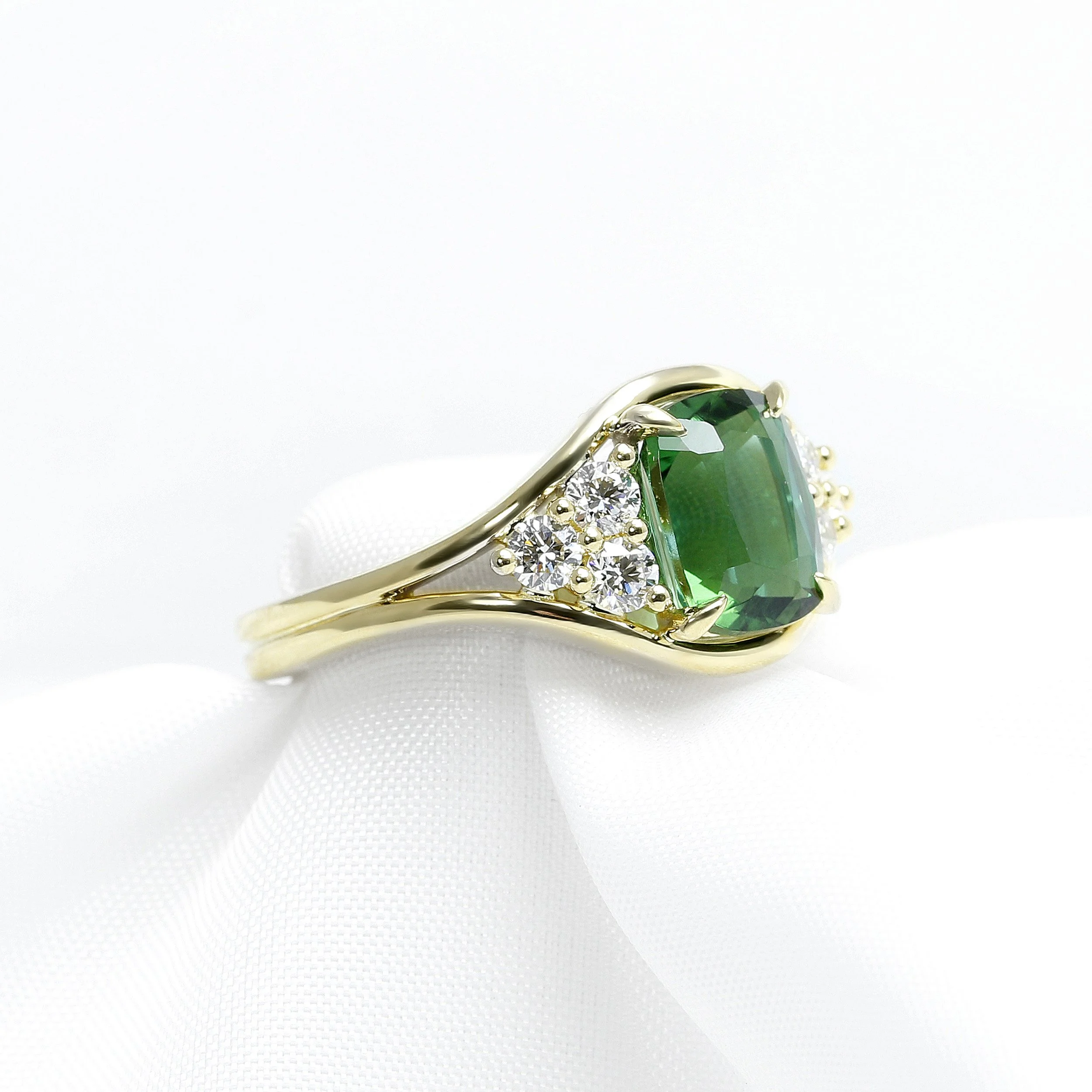 A dazzling 2.38ct cushion cut green tourmaline, set with a trefoil of diamonds either side. Surrounded by a setting and band of 18ct yellow gold.
