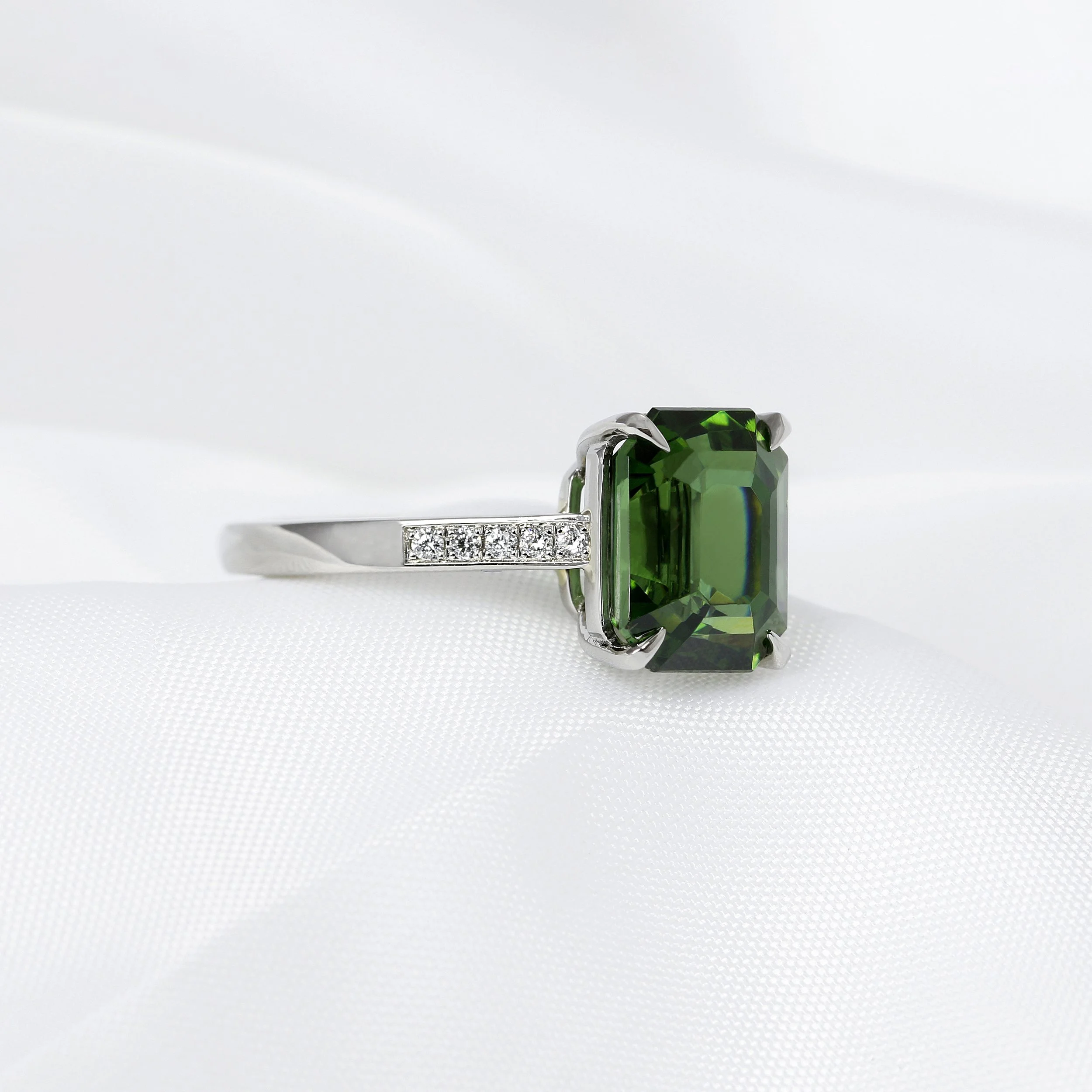 A stunning green octagonal step-cut 5.42ct zircon, solitaire ring with talon style claws. This ring has been handcrafted in platinum and has a grain set diamond band.