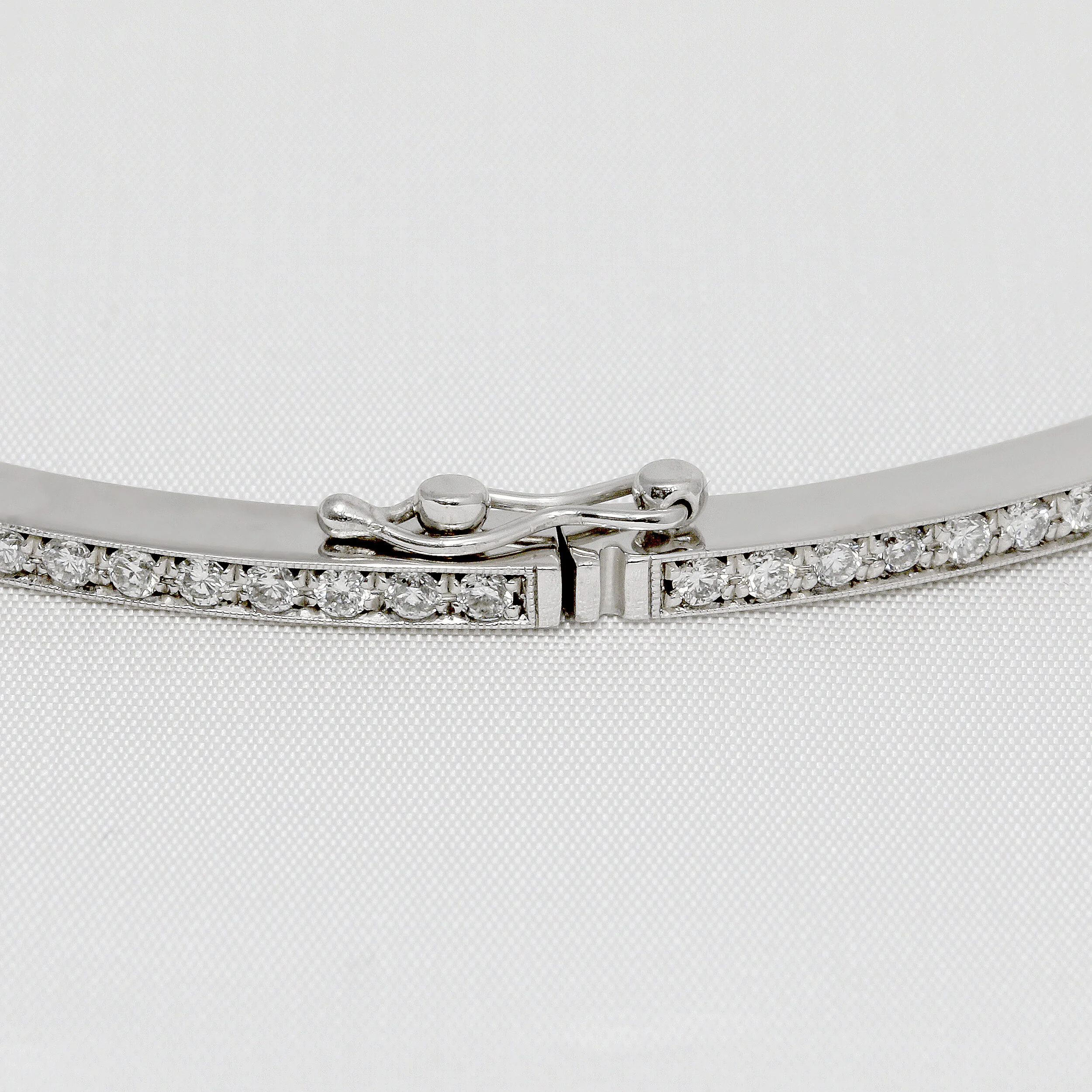 A sumptous full diamond hinged bangle, set with 99 grain set round brilliant diamonds in a channel of 18ct white gold. The bangle has a hinge for easy wear, with a safety catch for added security.