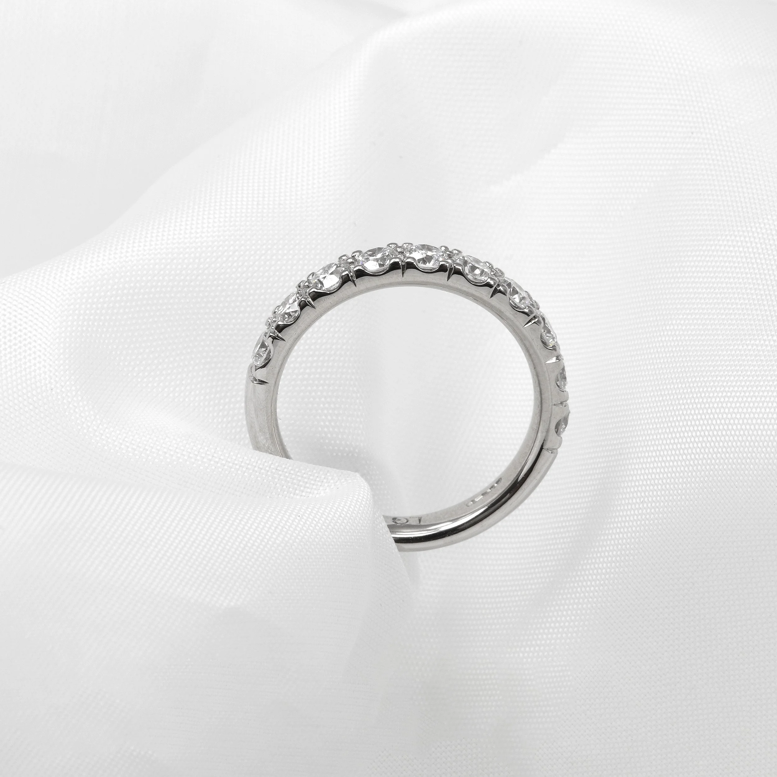 A gleaming diamond set half eternity ring, set with ten pieces totalling 1.11cts of Lab-Created modern round brilliant diamonds. This ring has been handcrafted in platinum and features cut-away claw settings.