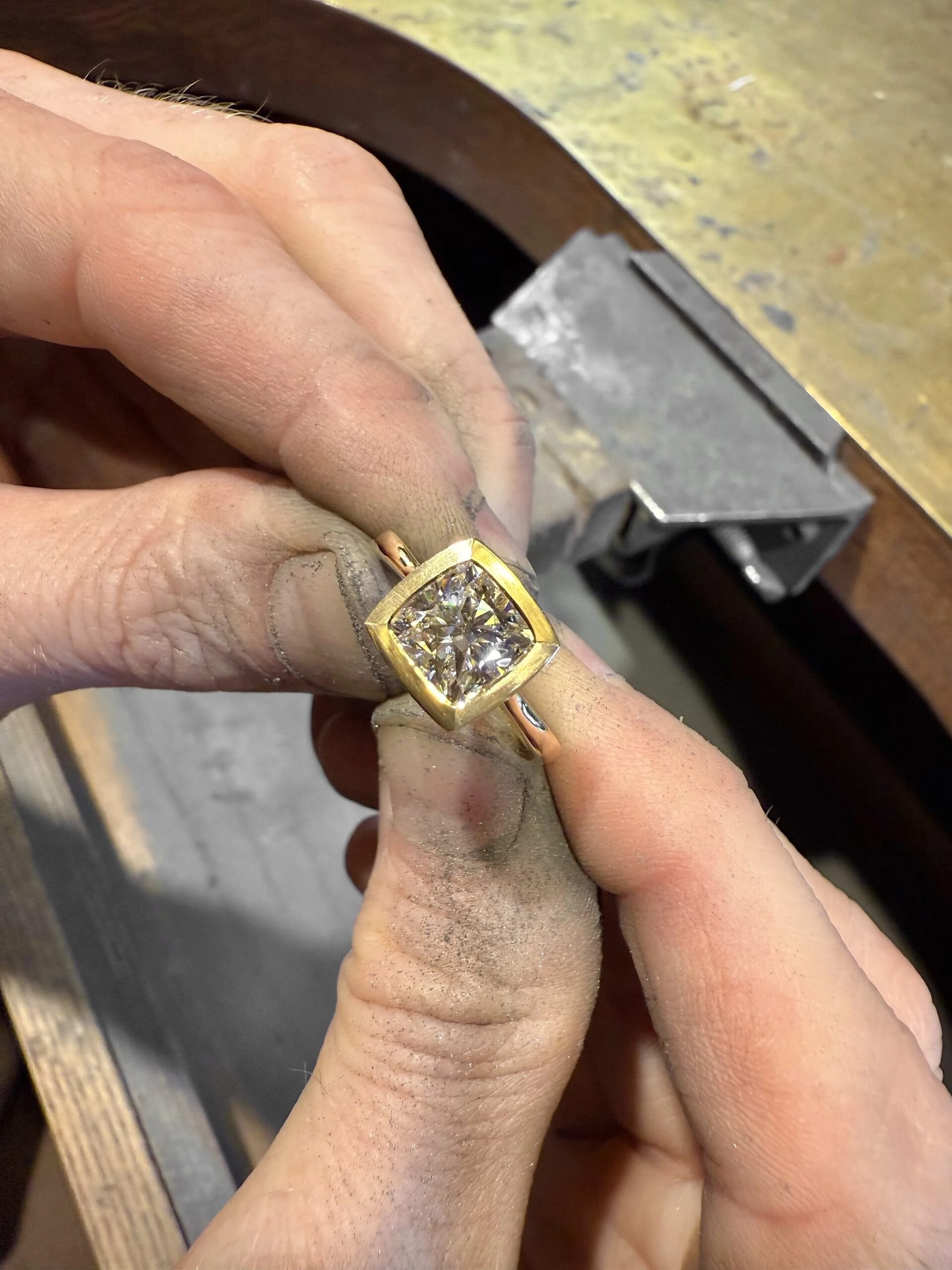 A captivating lab-created diamond solitaire ring. This ring features a lab created cushion cut diamond totalling 2.00cts. This ring has been handcrafted in 18ct yellow gold and has a feature edge rub-over style setting.