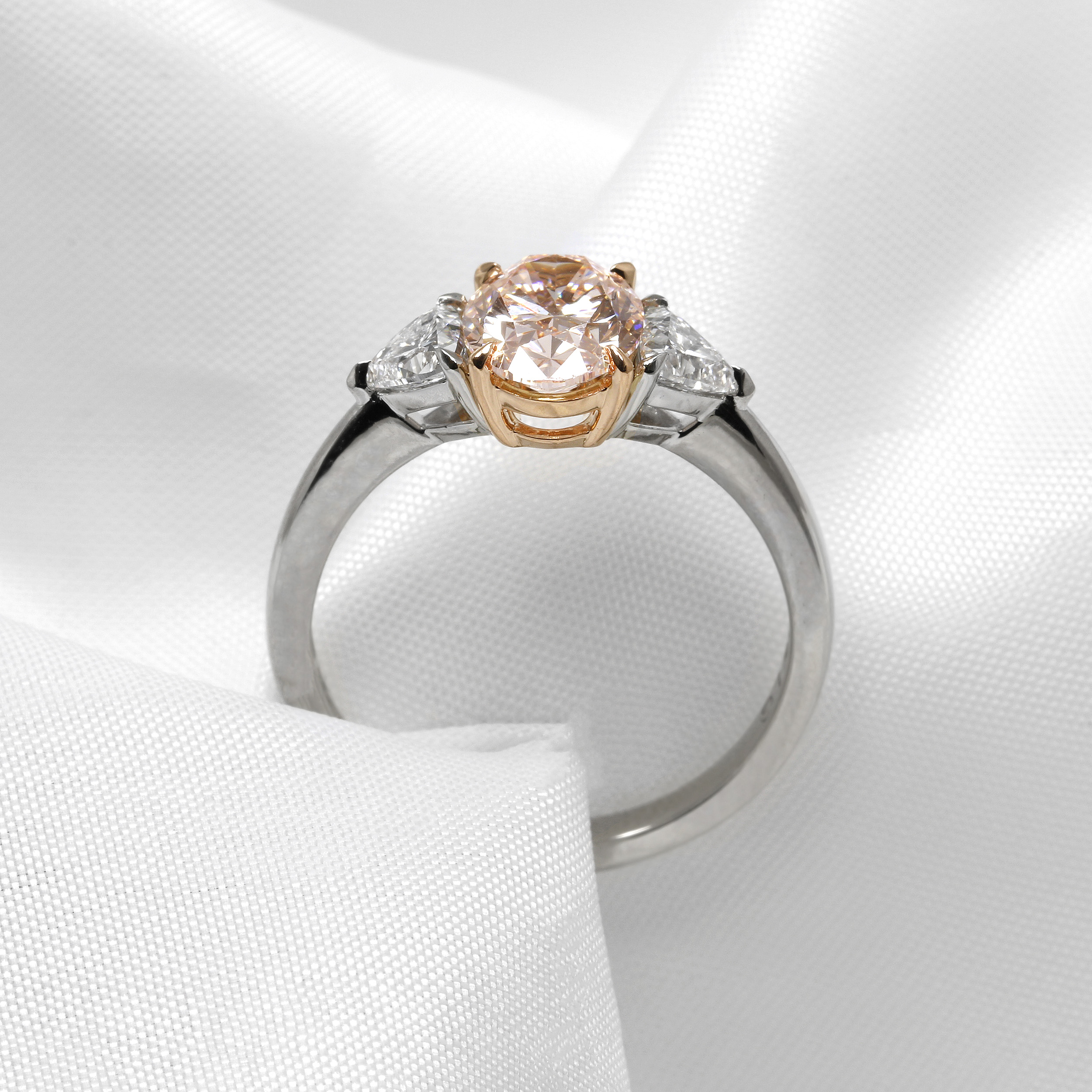 A Striking three stone ring featuring a 1.50ct fancy vivid pink oval laboratory grown diamond (IGI certified), set in 18ct rose gold talon claws. Accentuated Β by two trilliant cut diamonds, also laboratory created. The diamonds are set in platinum to accentuate their bright, white appearance.