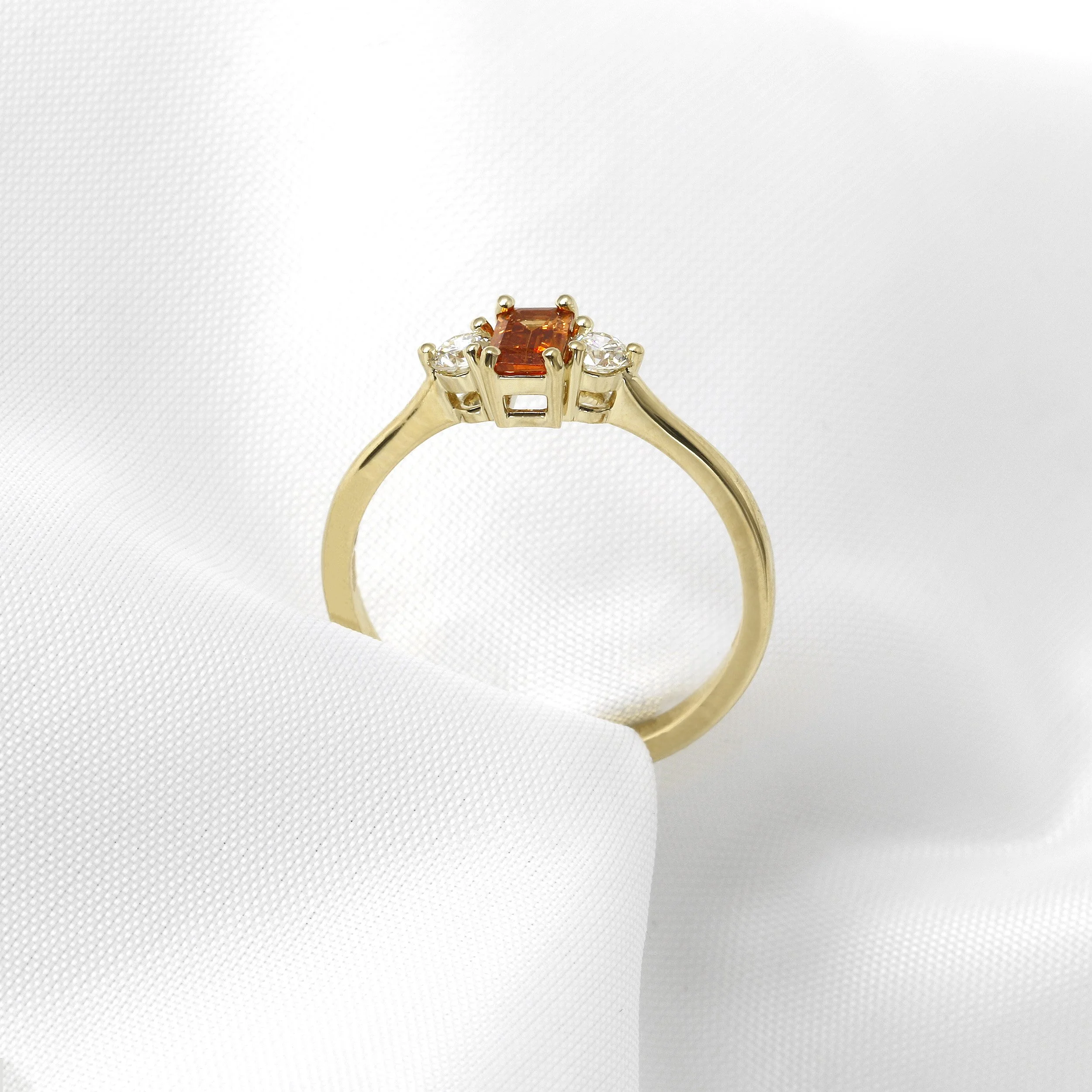 An octagonal step-cut mandarin garnet offering a vibrant pop of colour. Accentuated by two round brilliant cut diamonds for added brilliance and sparkle. All claw set in durable 9ct yellow gold.