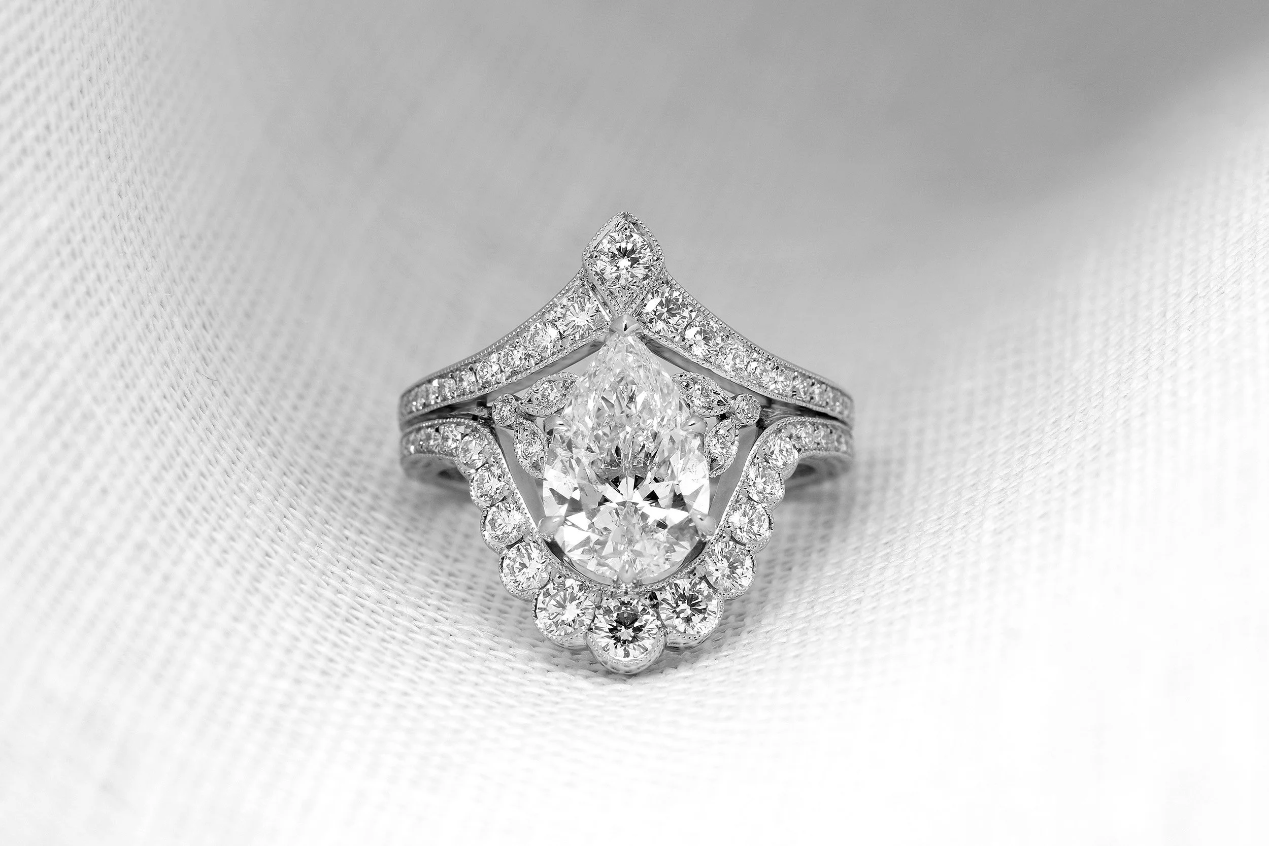 Showcasing a spectacular diamond tiara ring, featuring a central 2.50ct certified pear shape diamond, embraced by two diamond set tiaras, meticulously set in platinum.