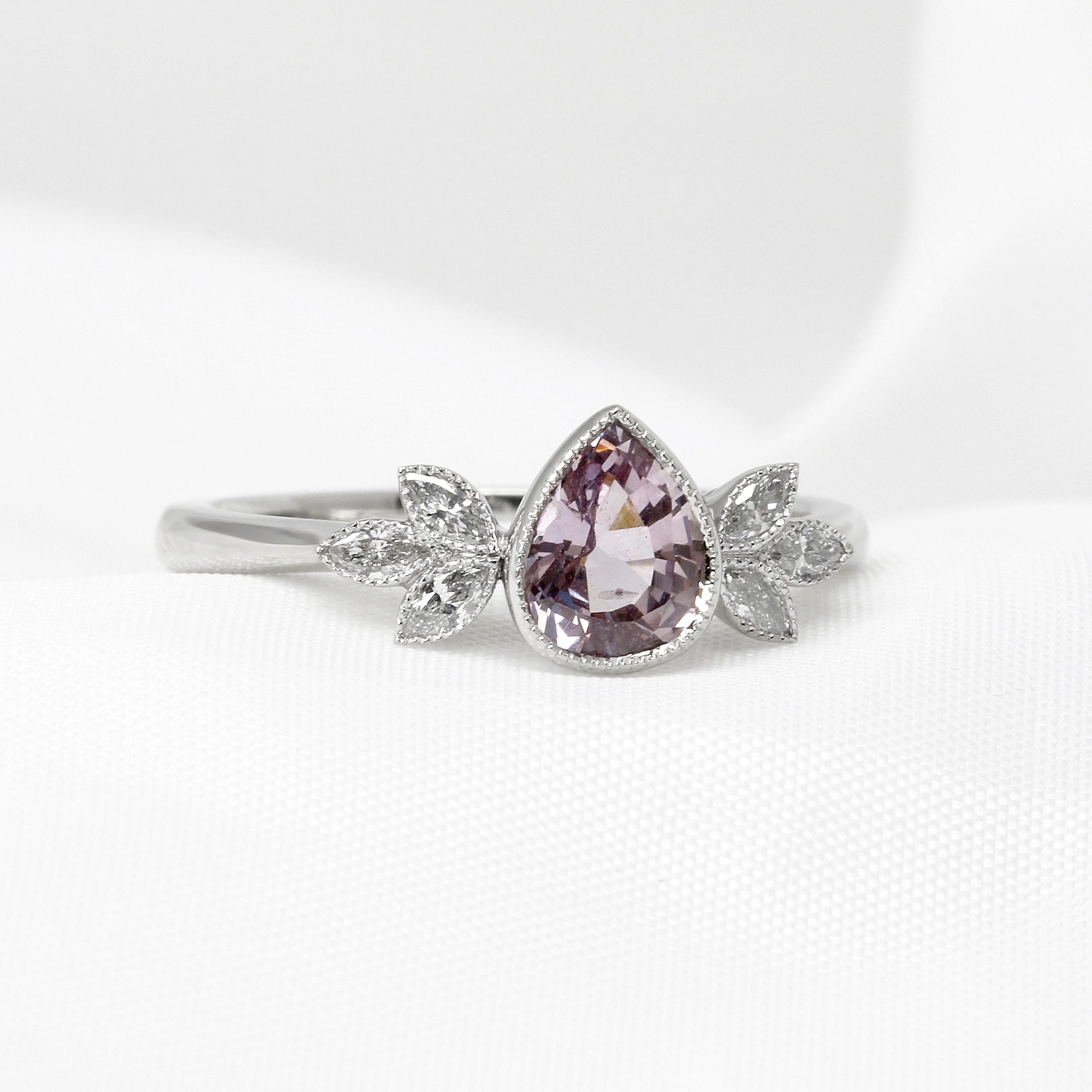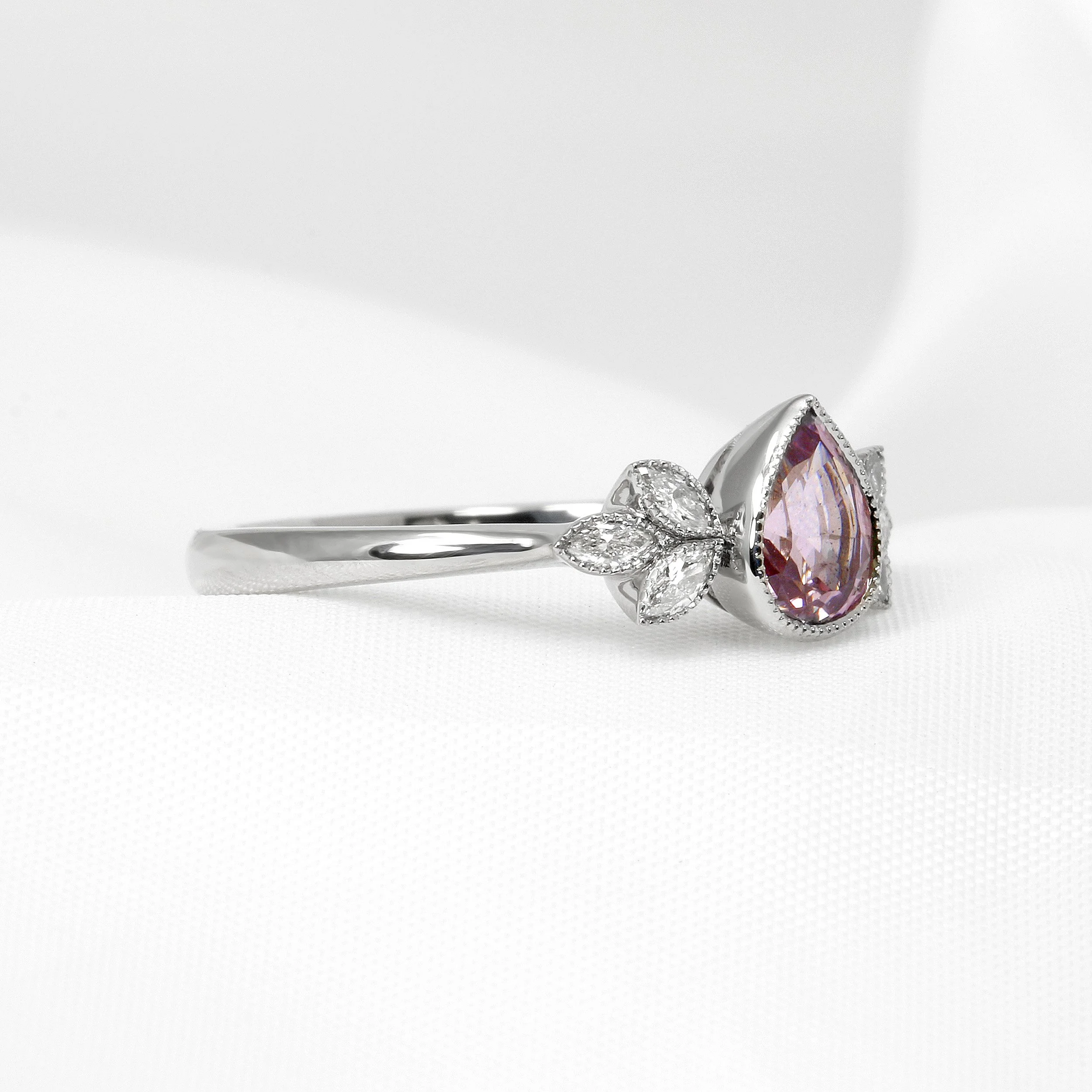 A refined and delicate, natured inspired design with a subtle, soft pink, pear shape sapphire, accented with a trio of marquise diamonds each side. This ring has been handcrafted in platinum, with rub over settings with millegrain edges.