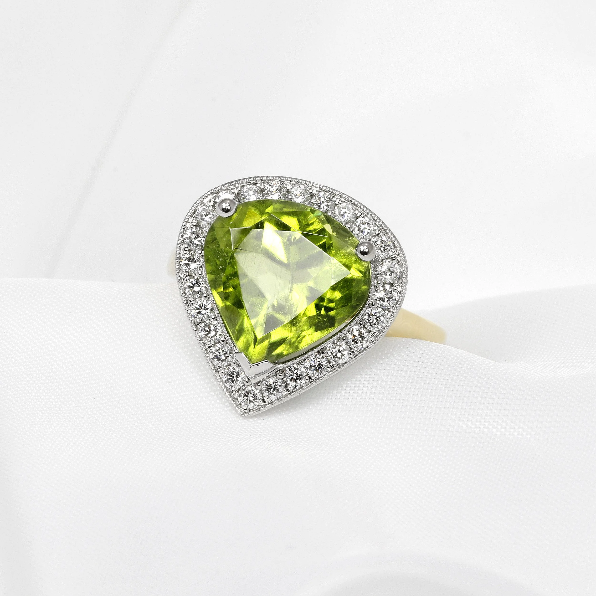 A lustrous bright lime green 7.80ct pear shaped peridot, set in platinum with a halo of round brilliant cut diamonds. This ring has been handcrafted with an 18ct yellow gold.