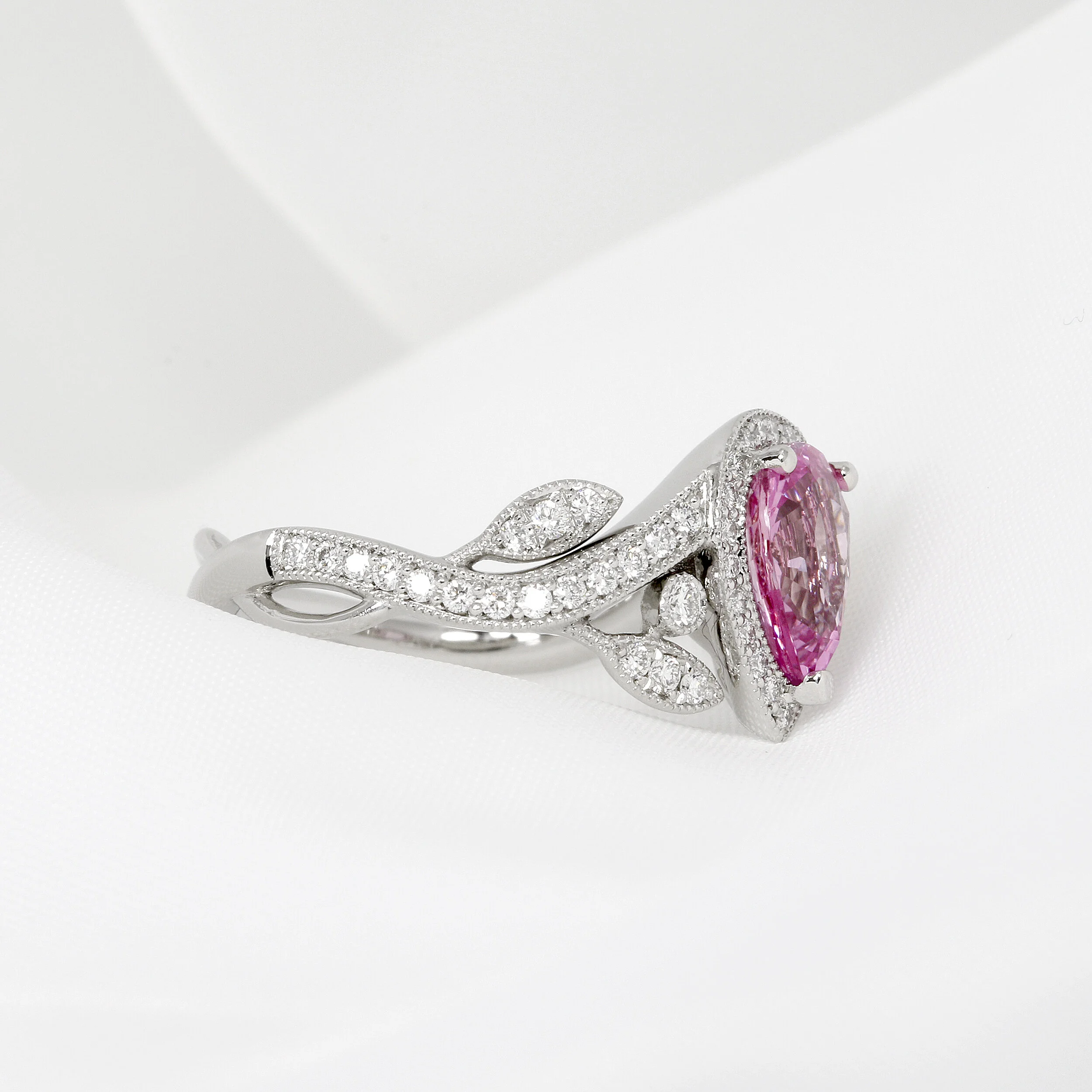A captivating 1.63ct pink pear shaped sapphire, set in a halo of round brilliant diamonds. This ring features a foliate style band, of intertwining bands, set with round brilliant diamond and handcrafted in platinum.