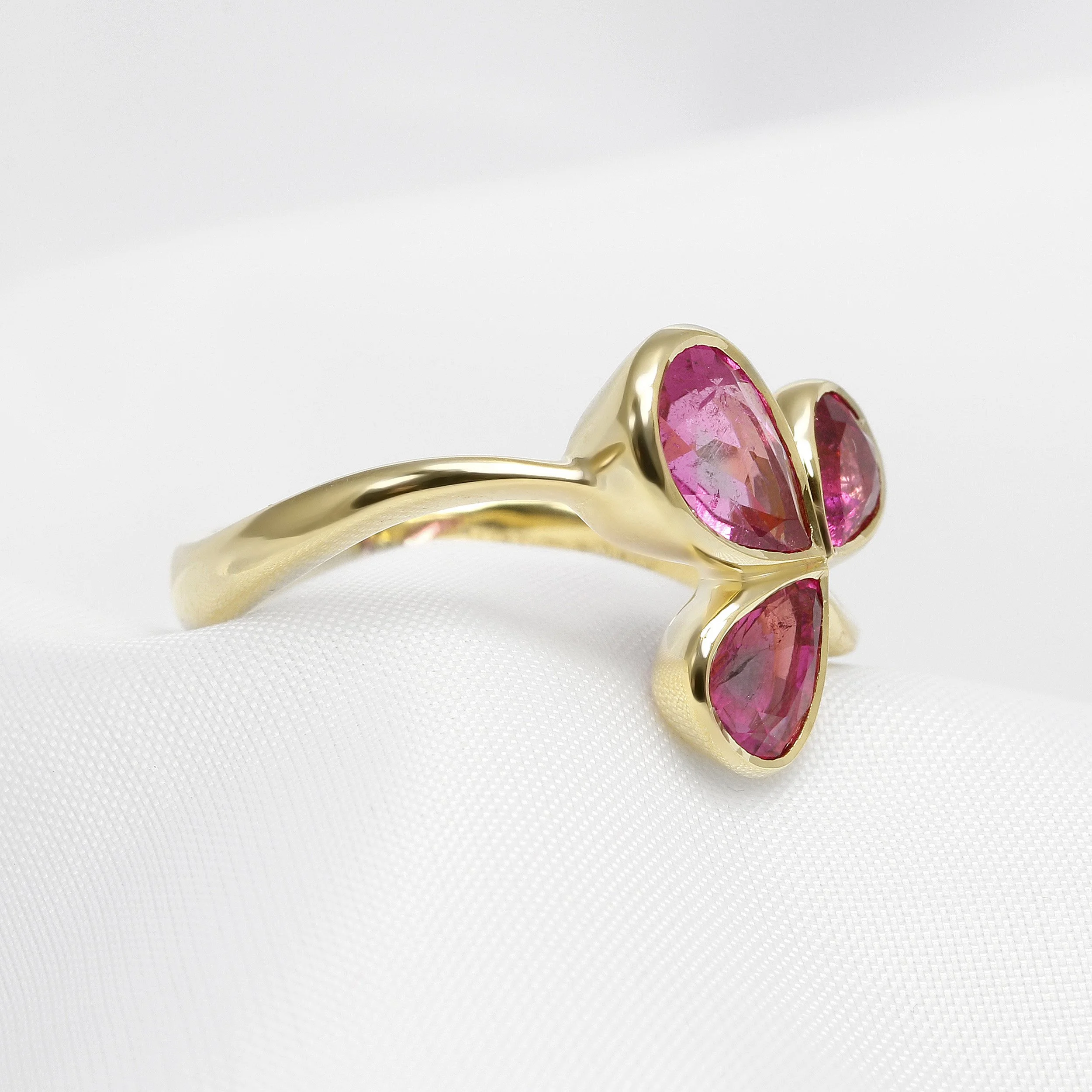 Three beautiful pear shape pink tourmalines in this modern rub-over style ring. This ring has been handcrafted in 9ct yellow gold.