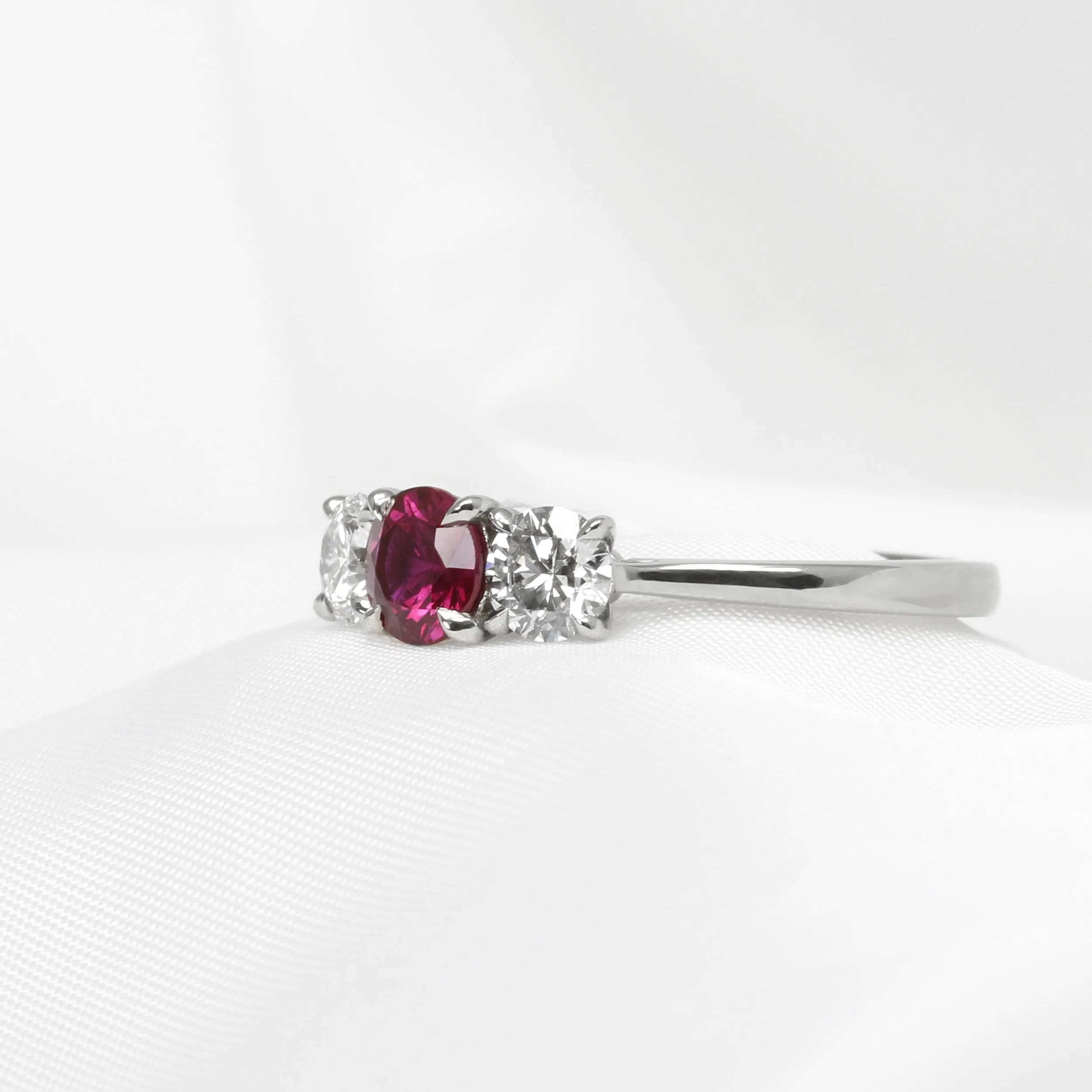 An alluring ruby and diamond three stone ring. Featuring a central 0.62ct round faceted ruby with two modern round brilliant diamonds. This ring has been handcrafted in platinum with claw style settings.