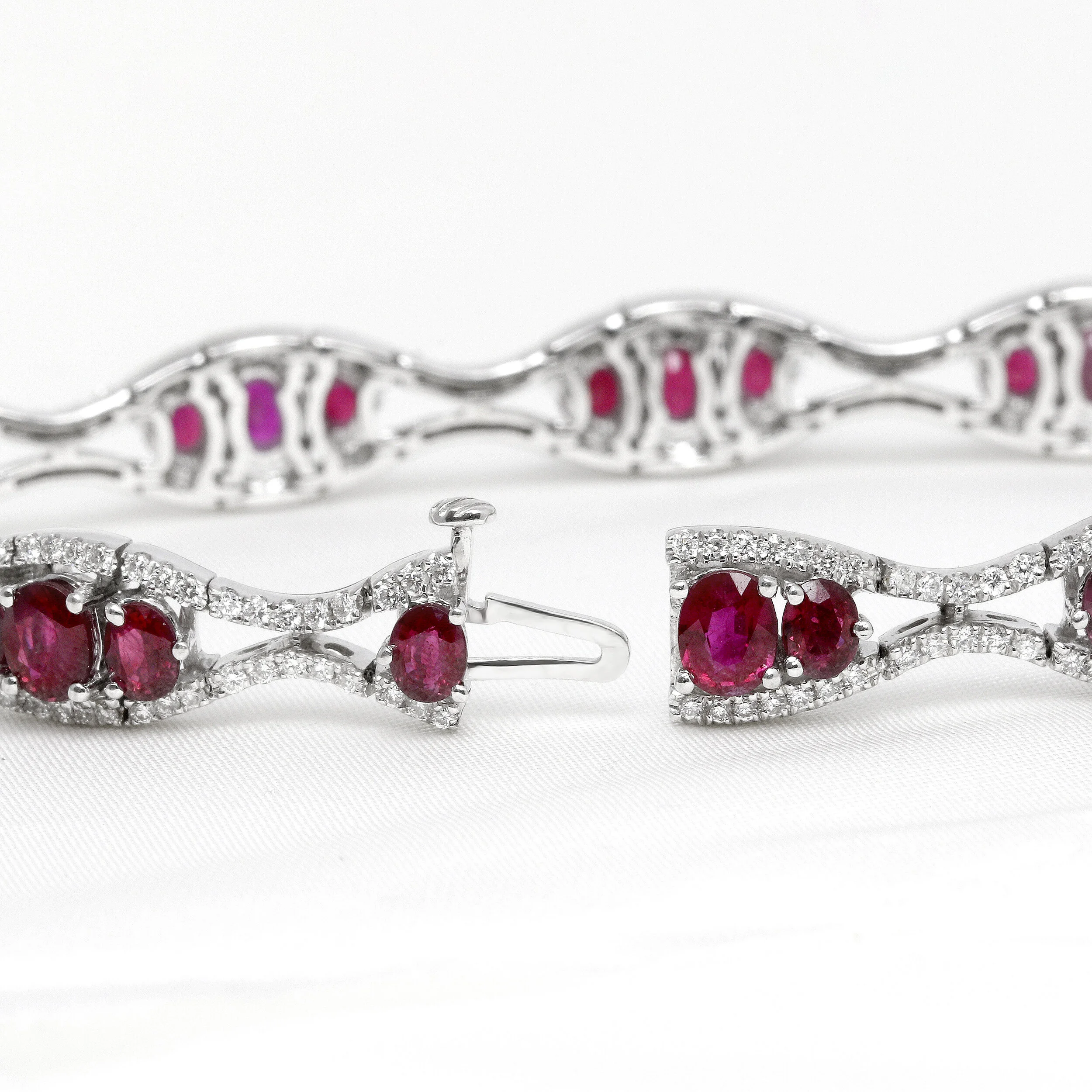 Multiple oval faceted rubies, set in groups of three in a diamond set wave bracelet. This piece is handcrafted in 18ct white gold.