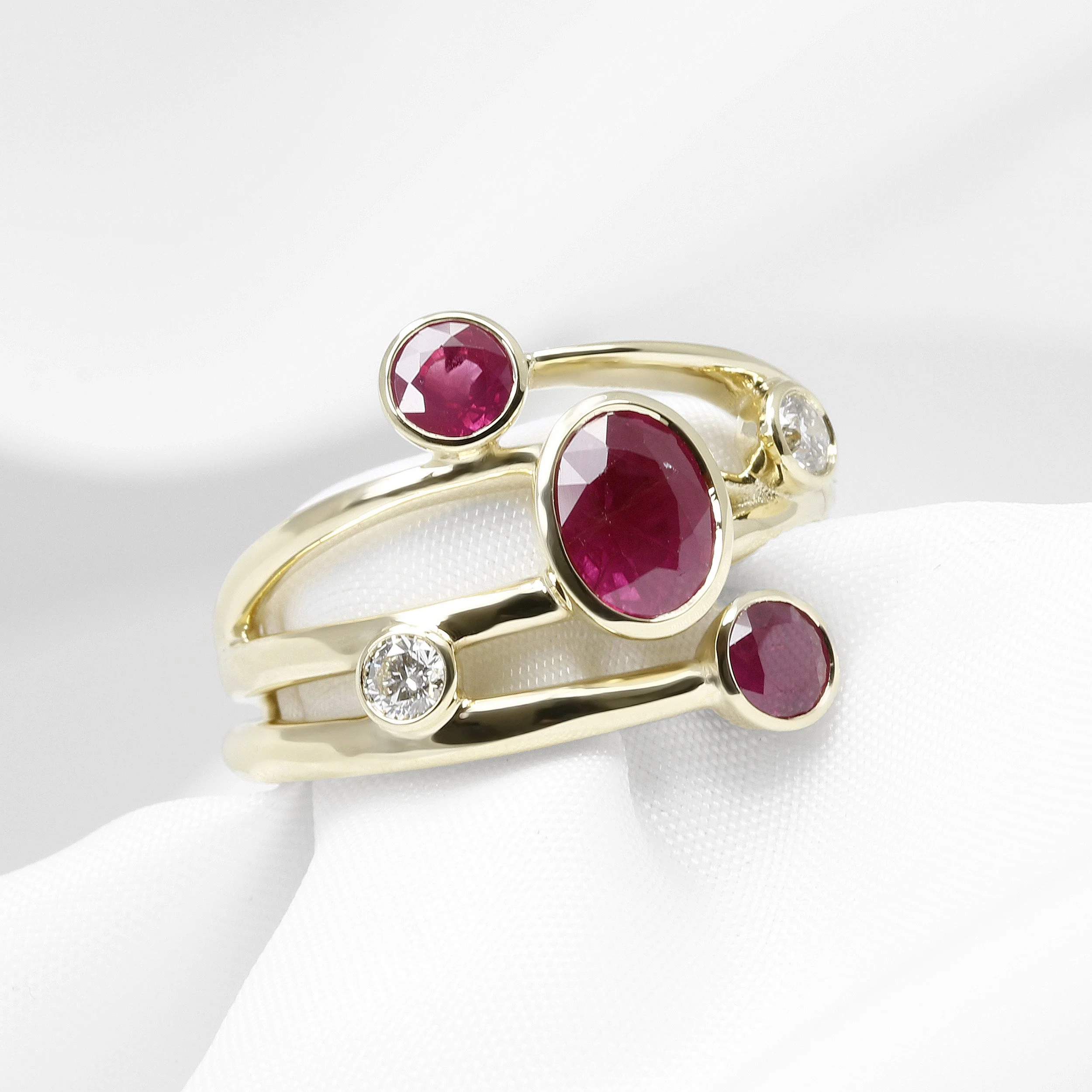 A delightful scattered ruby and diamond rub-over set multi-band ring. Featuring an oval and round rubies, round brilliant diamonds handcrafted in 9ct yellow gold.