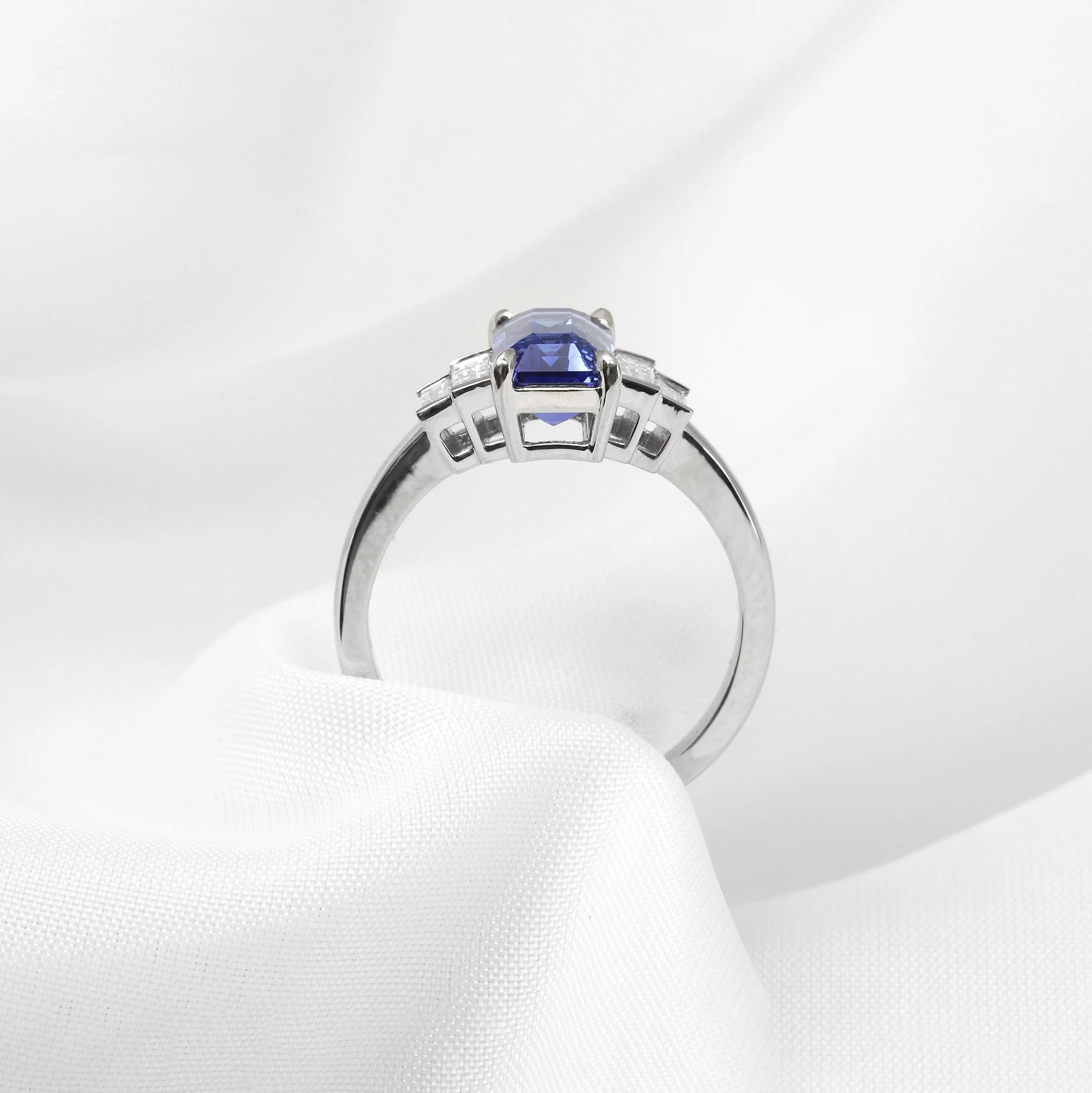 A wonderful sapphire and diamond ring. Featuring a central blue octagonal step cut sapphire, accompanied by graduating baguette diamonds. This ring has been handcrafted in platinum with the central sapphire being claw set and the baguette diamonds bar set on either side.