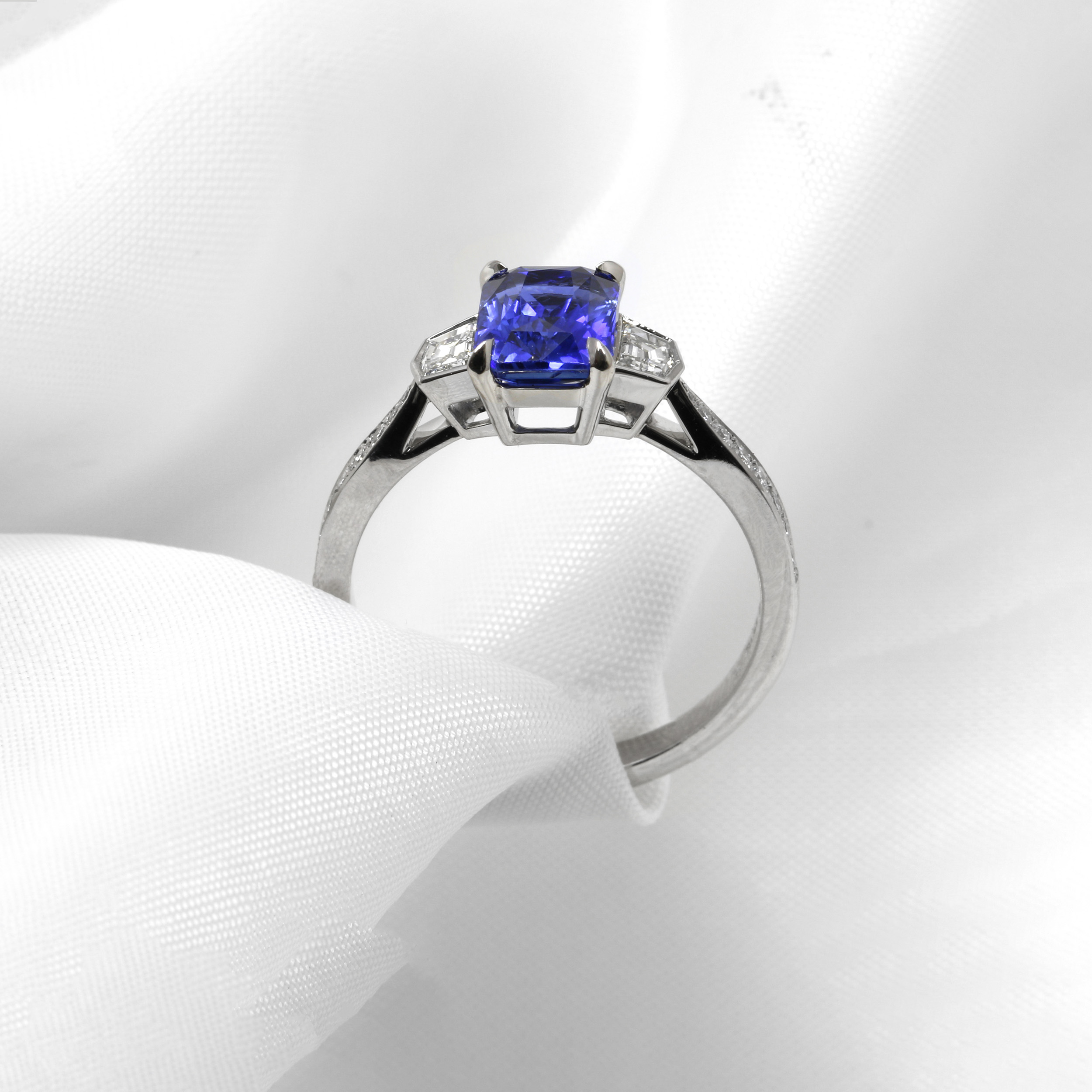 Elegant platinum ring featuring a vibrant 1.50ct octagonal faceted sapphire in a talon claw setting. Accented by two cadillac cut diamonds, totalling 0.24ct. Additional sparkle is created by round brilliant cut diamonds grain set on the shoulders.
