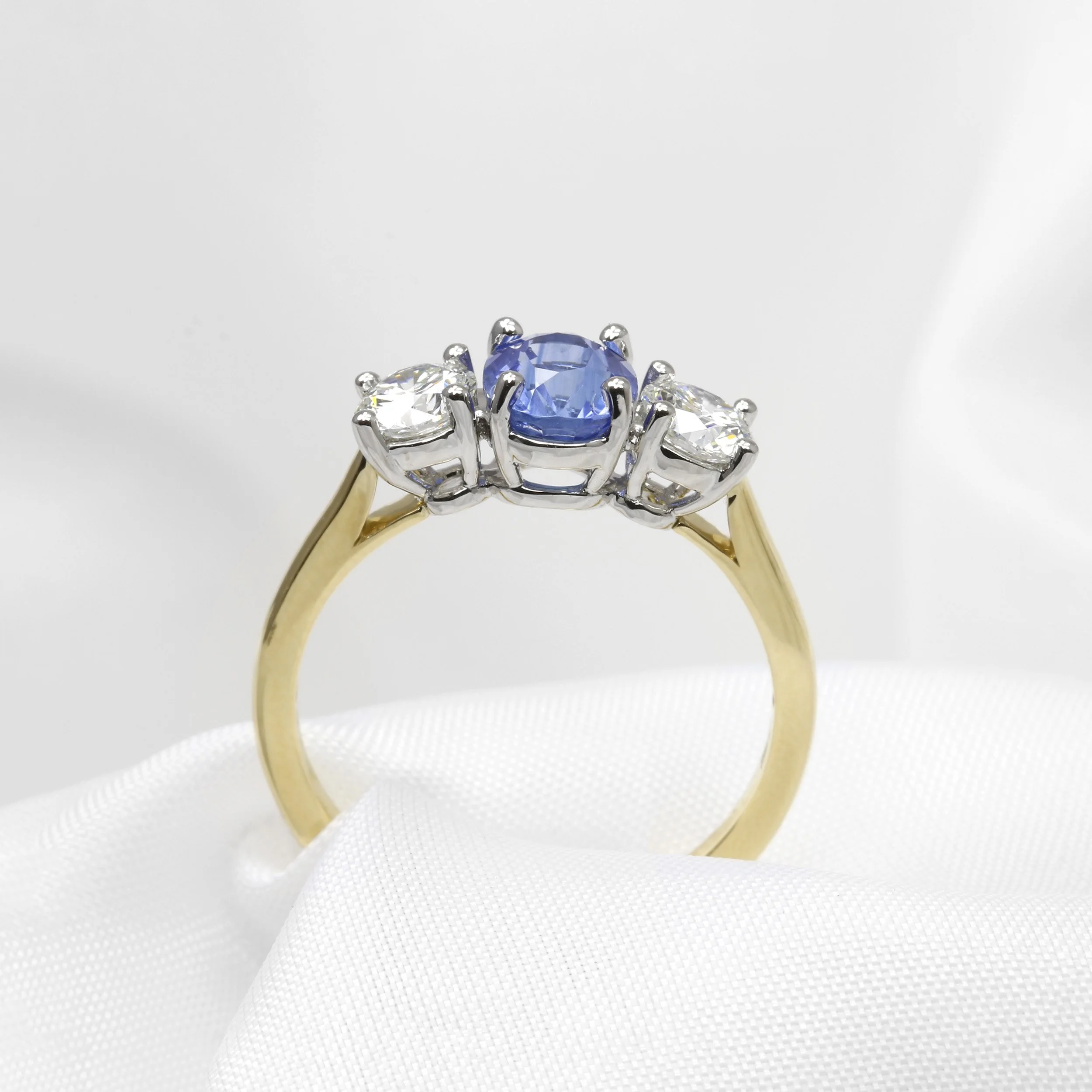 An elegant three-stone ring featuring a 1.32ct oval blue sapphire, complimented by two GIA certified 0.33ct round brilliant diamonds. This ring has been handcrafted in 18ct yellow gold with platinum claw style settings.