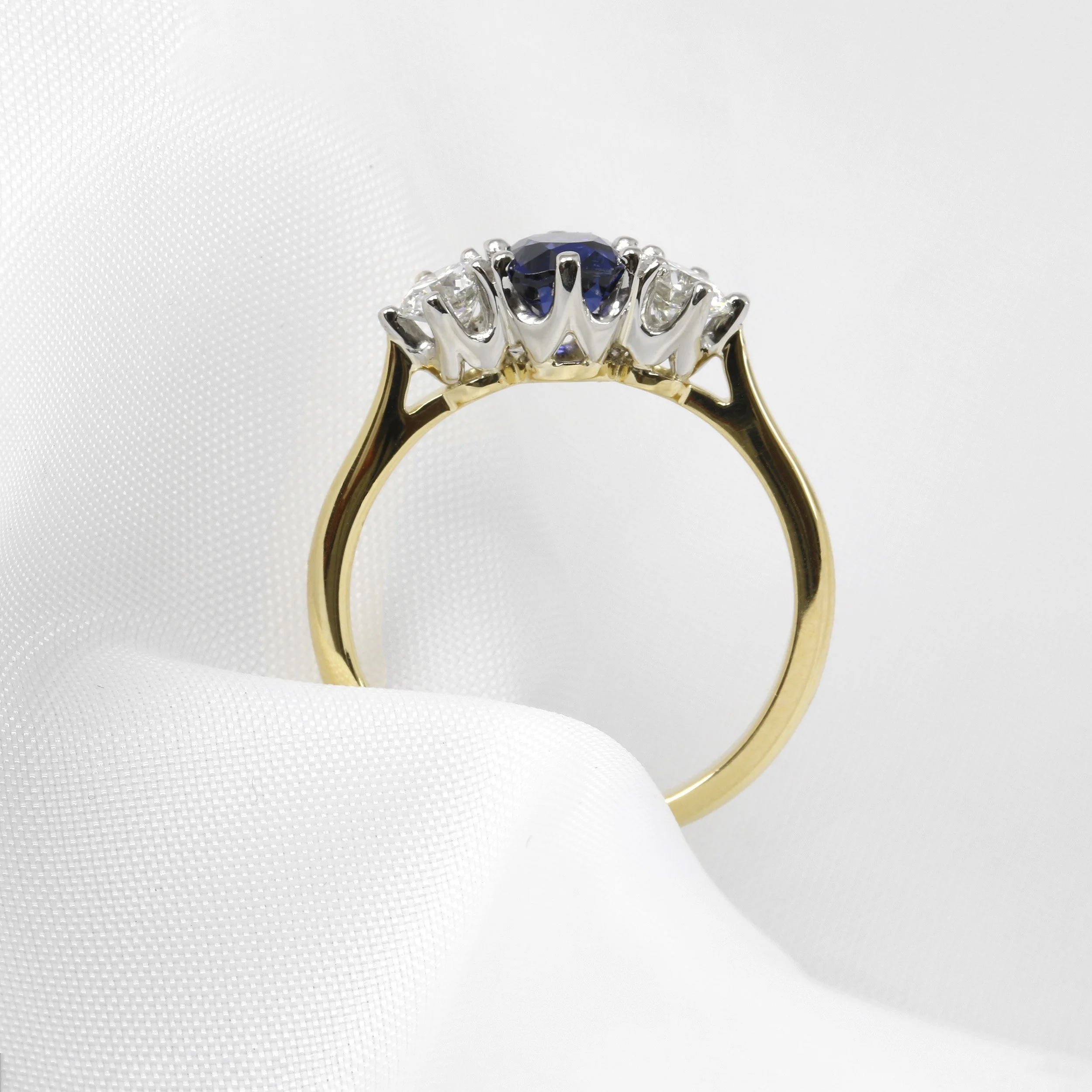 A beautiful three stone sapphire and diamond ring. The central blue sapphire is cushion cut and totals 0.82cts, accompanied by two GIA certified round brilliant diamonds totalling 0.45cts. This ring has been handcrafted with an 18ct yellow gold band and platinum claw style settings.