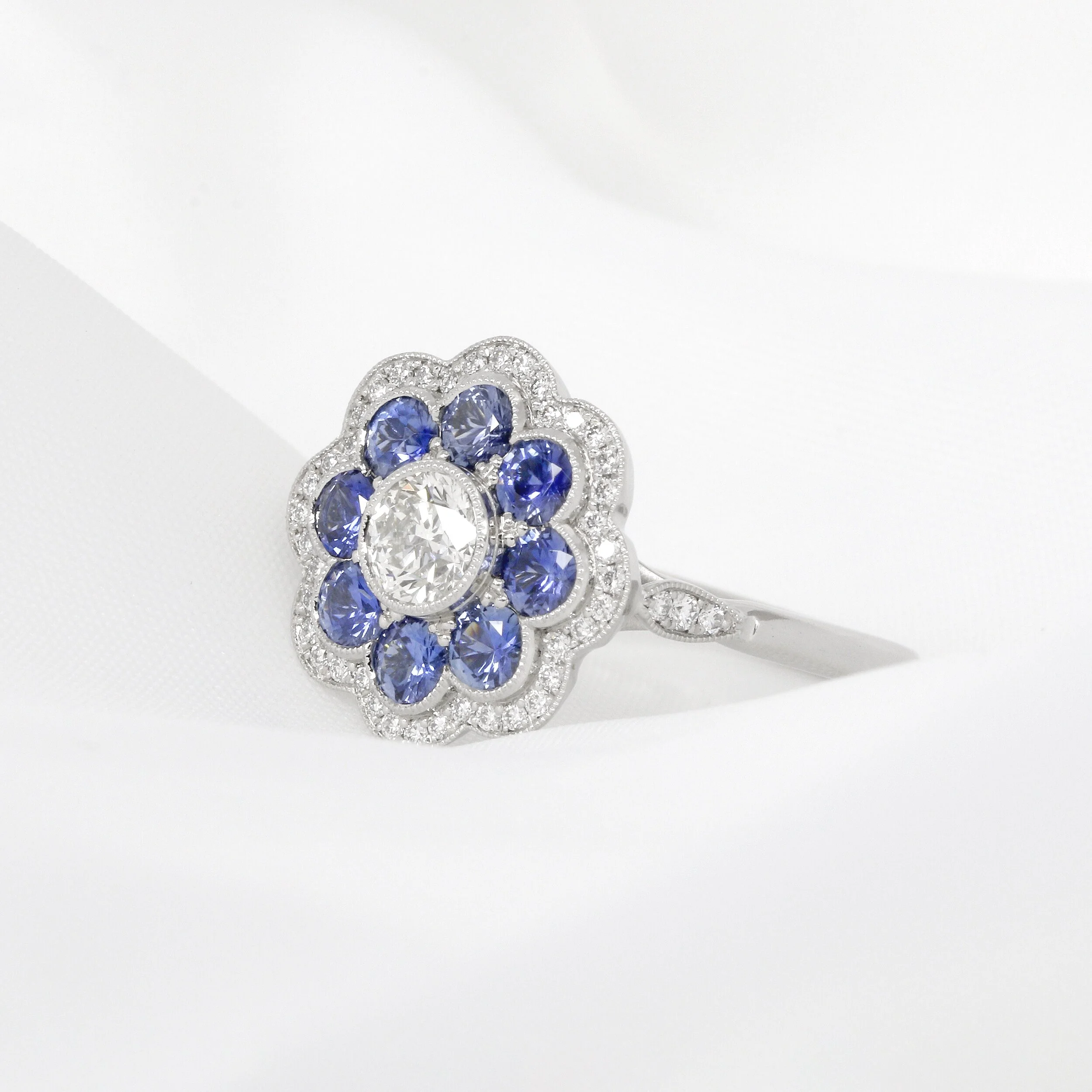 A central 0.40ct round brilliant diamond, surrounded by eight blue sapphires in a daisy style setting. The central daisy has a full diamond halo, and has been handcrafted in platinum with a diamond set band.