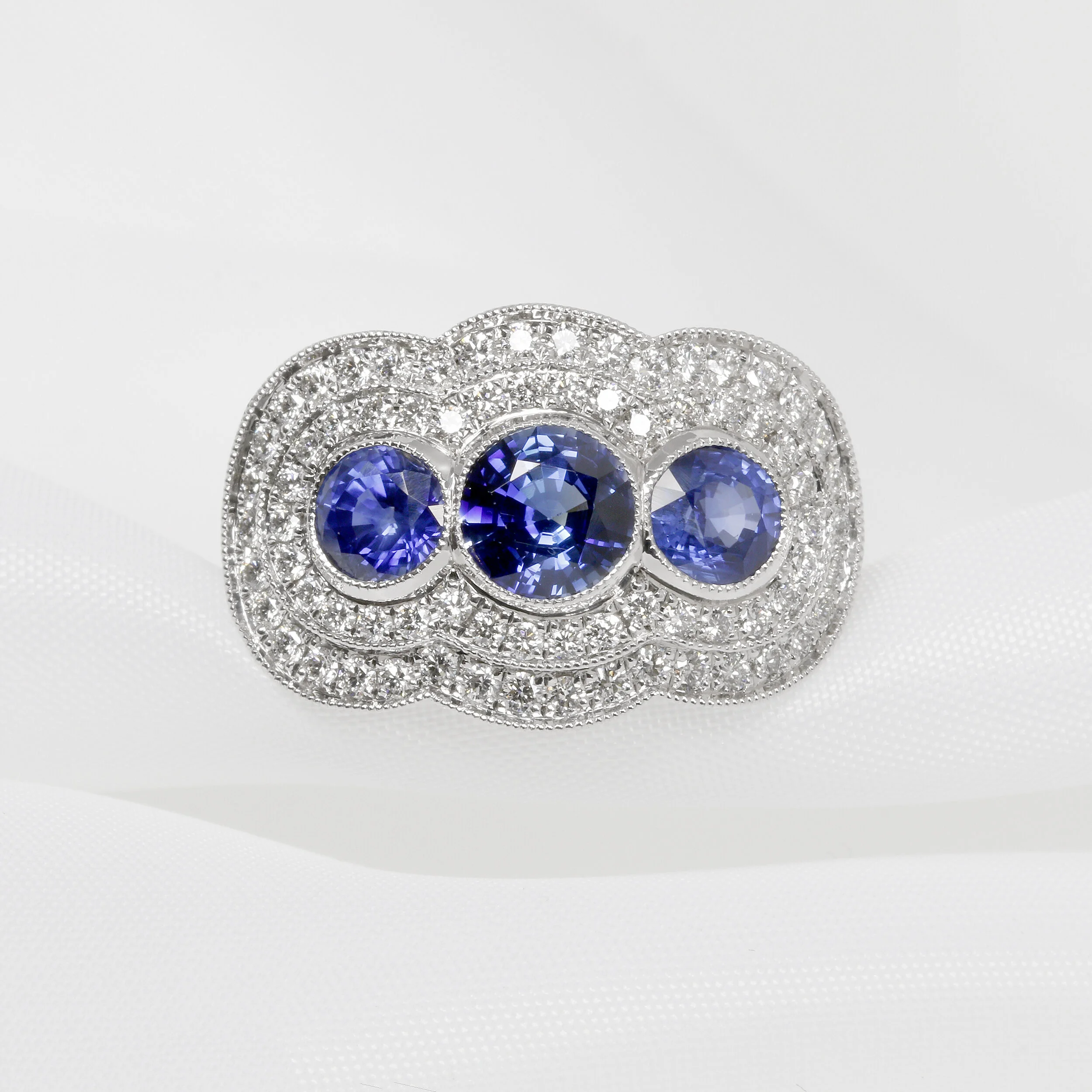 Three beautiful matching round blue sapphires, set with a double halo of diamonds in this sparkling cocktail ring. 2.35cts of round diamond cut blue sapphires, with two rows of round brilliant diamond halo totalling 0.65cts. This ring has been handcrafted in 18ct white gold, with rub-over and grain style setting.