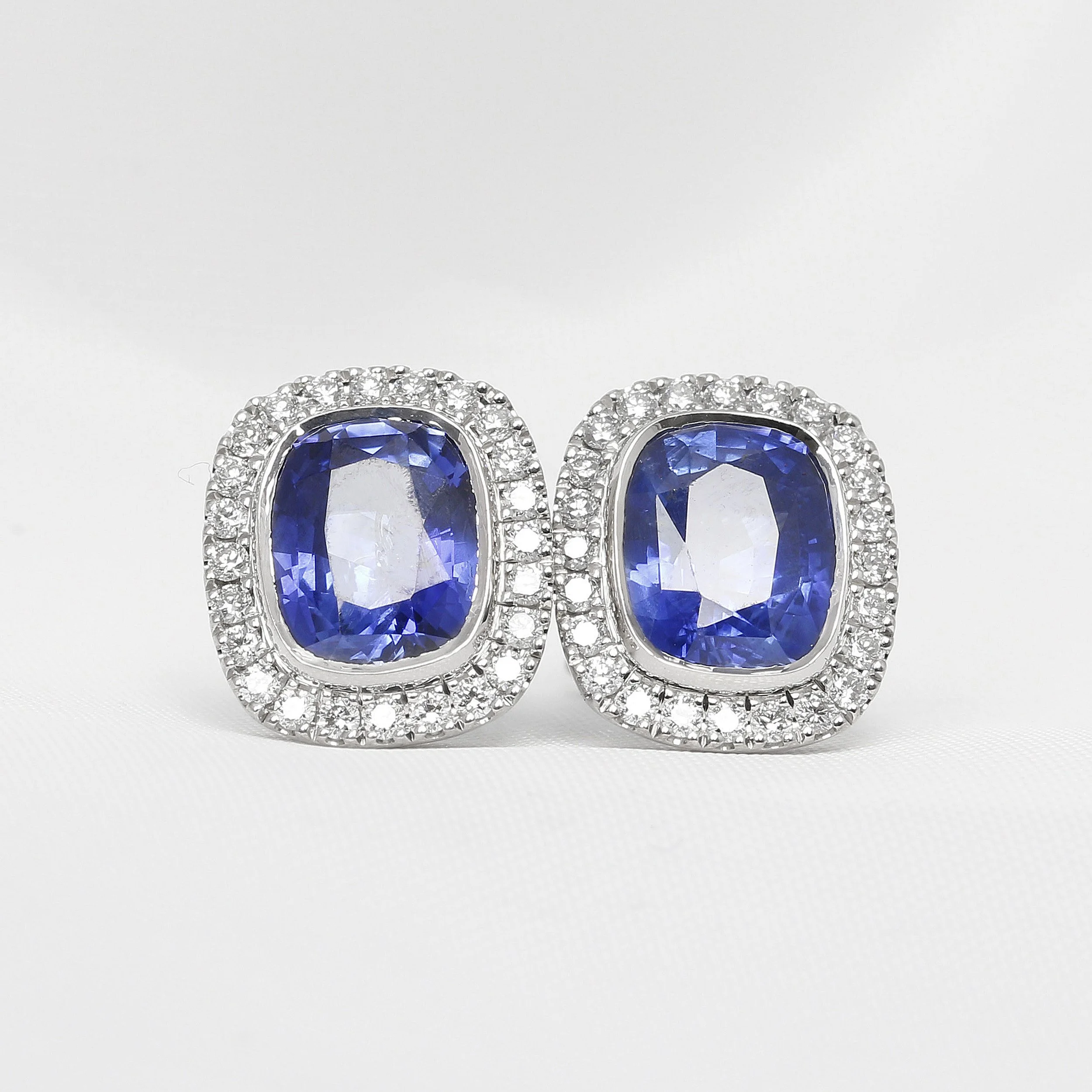 A pair of luxurious blue sapphire earrings, set with two cushion cut blue sapphires totalling 3.36cts. These earrings have been handcrafted in 9ct white gold and feature a grain set diamond halo.