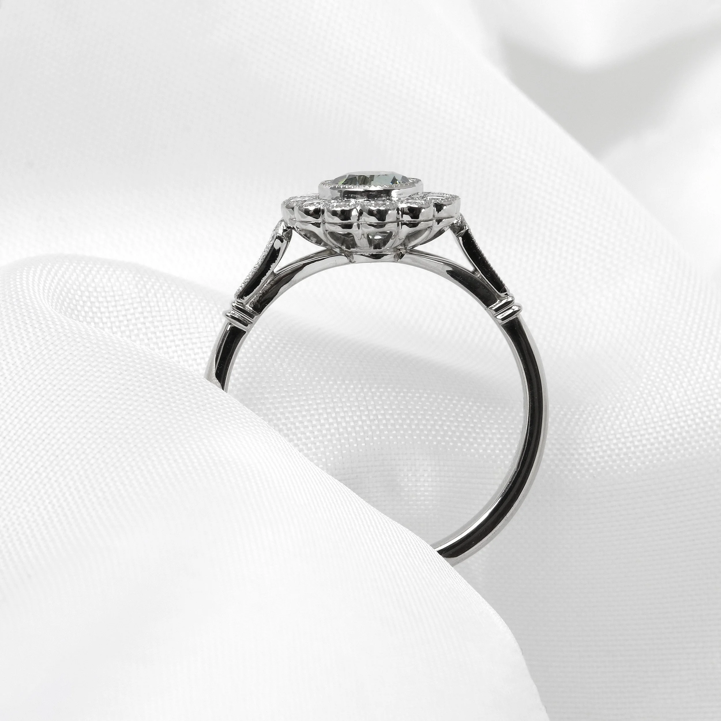Teal sapphire and diamond daisy cluster ring, exquisitely handcrafted in platinum. Featuring a vibrant teal sapphire at its centre, surrounded by a halo of sparkling modern round brilliant diamonds.