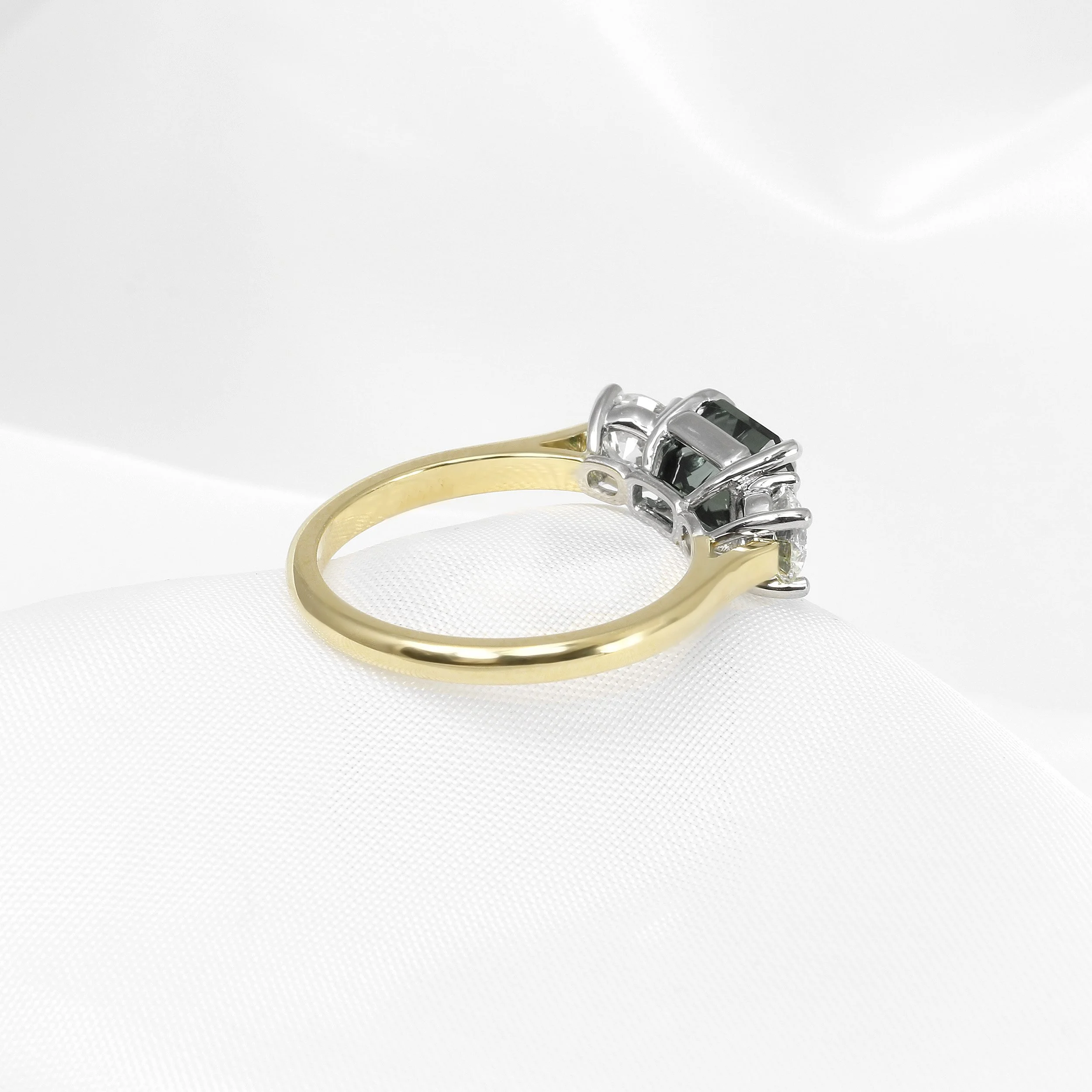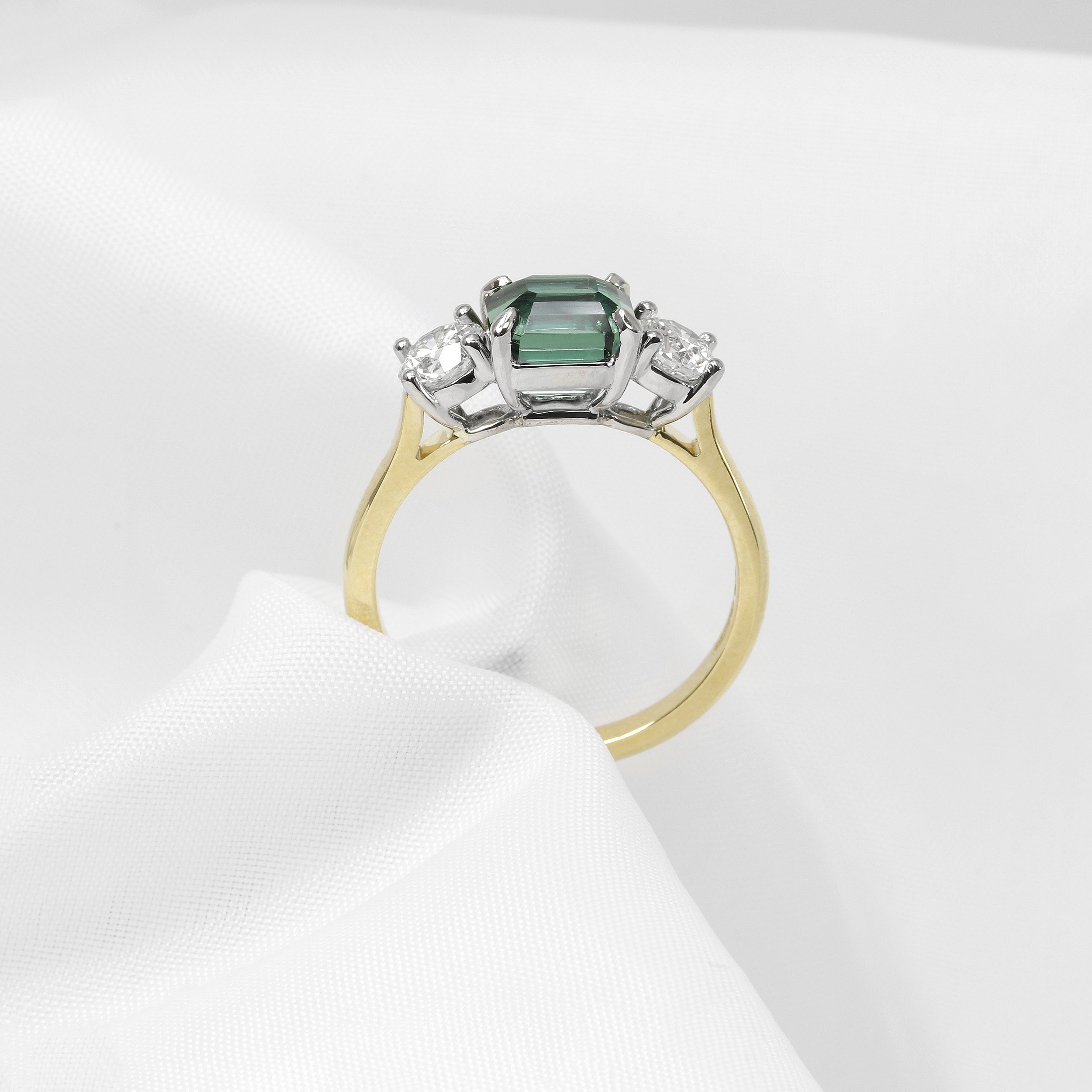 A gleaming green tourmaline and diamond three stone ring. The central 1.94ct green octagonal step cut tourmaline is accompanied by two GIA certificated 0.40ct modern round brilliant diamonds. This ring has been handcrafted in platinum and 18ct yellow gold.