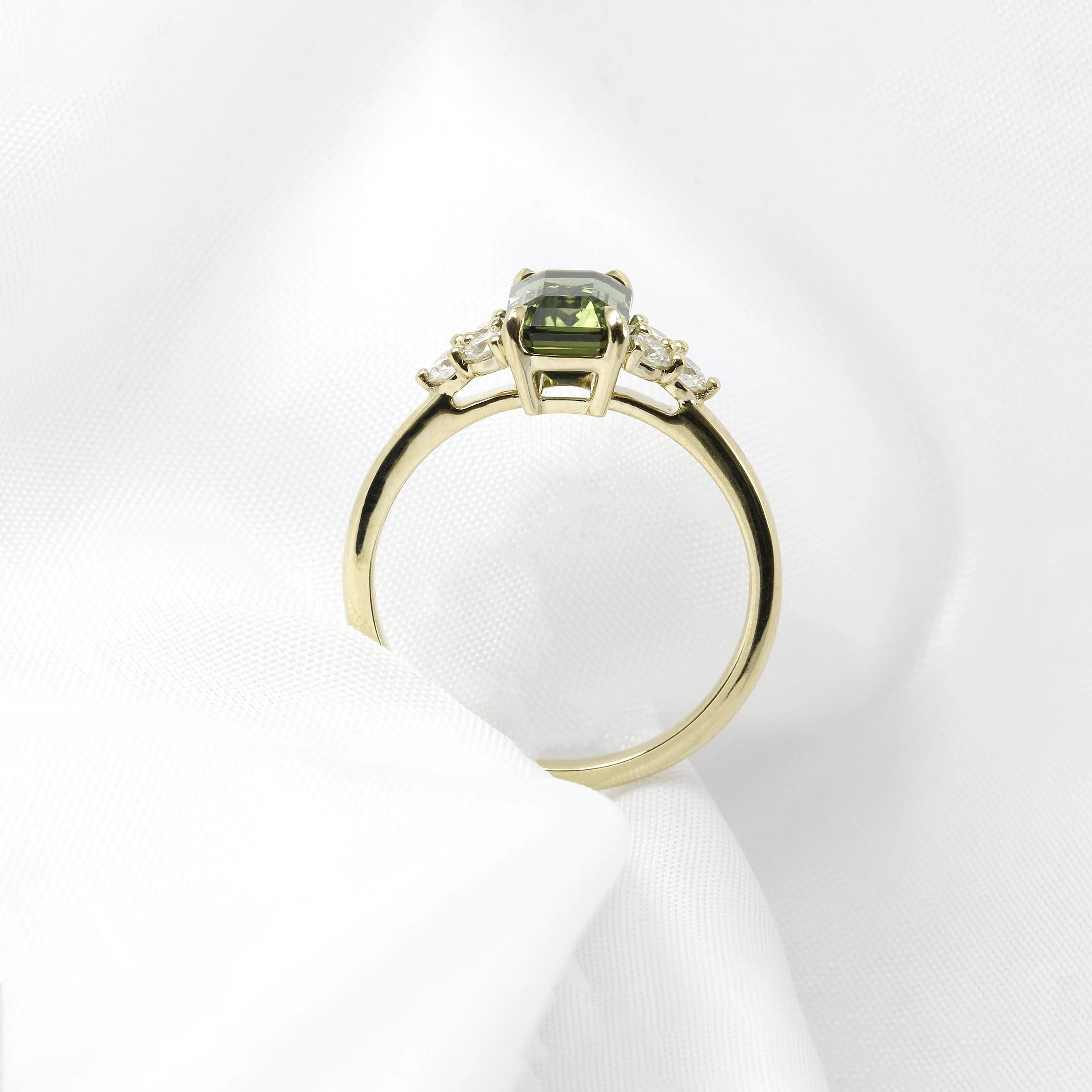 An enchanting tourmaline and diamond trefoil ring. A stunning green octagonal step cut tourmaline totalling 1.60cts, accompanied by a trefoil of 6 round brilliant cut diamonds. This ring has been handcrafted in 9ct yellow gold and features claw style settings.
